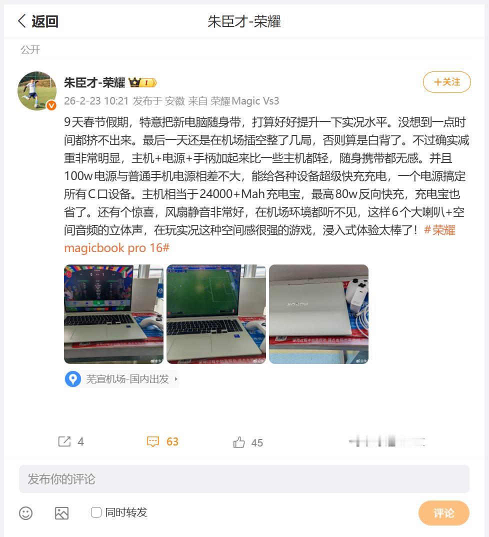刚刚看到荣耀PC产品总经理朱臣才透露的,关于即将发布的荣耀笔记本新品的体验内容,朱总表示新品游戏性能、空间音频、静音效果做的都蛮好,最大的特点就是重量减轻非常明显,100w电源与普通手机电源相差不大,外出时新品笔记本电脑相当于24000+Mah充电宝,反向充电最高80W,妥妥让小伙伴们的续航焦虑没有啦 畅聊数码新品 数码资讯