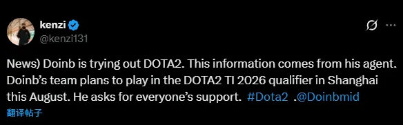 Doinb将挑战Dota2职业赛事。据向其经纪人确认,Doinb将带队参加于2026年8月在中国上海举行的DOTA2国际邀请赛(TI15)中国预选赛,希望大家能够多多支持。