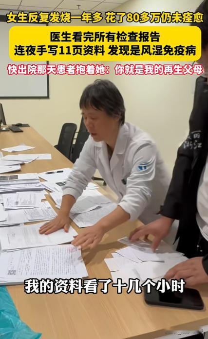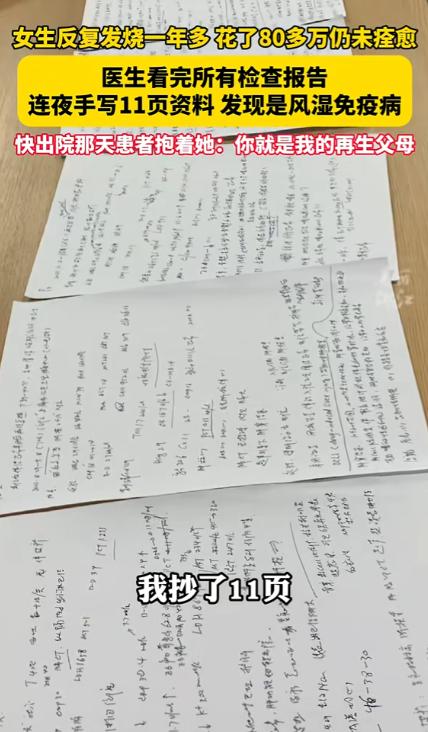 2024年,浙江一女子反复发烧一年多,为了治病花了80多万不见效,结果来到义乌求医后,医生花了十几个小时研究她的病例,而后一个举动惊呆众人,不料却找出问题所在,女子感恩称她为再生父母。 义乌医院门诊大厅,女子手捧锦旗和手写感谢信,紧攥许彩青的手。 信纸上字迹娟秀饱含深情,每一句都藏着重获新生的感恩。 一年前的她,被怪病折磨得瘦骨嶙峋,连死的念头都有过。 她花光80万家产求医无果,是许彩青的细心与责任救了她。 女子轻抚锦旗上“医者仁心”,眼眶瞬间红了。 她指着红润的脸颊笑:“你看,我现在能正常上班了。” 这份生机,和一年前萎靡绝望的她判若两人。 2024年深秋,浙江女子第一次被高烧缠上时并未在意。 起初只是低烧,她以为换季受凉,吃两片退烧药就没管。 不料低烧没好,反倒烧成三十九度多,浑身滚烫吓人。 家人送她去医院挂水吃药,体温勉强下降,隔天又反弹。 高烧反反复复一烧就是一年多,两百多个日夜无安宁。 最高体温飙到四十度,关节像被烈火灼烧,疼得直打滚。 四肢发软,连喝水、翻身都需要家人小心翼翼搀扶。 好好一个人,被这场怪病折磨得不成人形。 家人放下工作,带着她四处奔波求医。 从浙江本地三甲,跑到上海、杭州的知名医疗机构,共八家。 抽血、拍片、活检,各种检查反复做,报告单堆成小山。 医生们的诊断五花八门,始终没有定论,让人迷茫。 有的说罕见病毒感染,开了进口药,吃了毫无效果。 有的怀疑血液系统有问题,反复化验仍找不到症结。 还有的坦言不明原因发热,无能为力,只能保守治疗。 药吃了一筐又一筐,针吊了一瓶又一瓶,病情毫无起色。 家里积蓄很快花光,为续治疗费,家人四处借钱。 前后共花80多万,欠了巨额外债,却没换来半点希望。 女子看着家人操劳负债,心如刀绞。 有好几次,她趁家人不注意,偷偷拔掉针管想放弃治疗。 “别治了,我是累赘,花光钱也治不好,放过你们吧。” 她说这话时声音沙哑,眼泪直流,绝望溢于言表。 家人抱着她哭着劝说,哪怕只有一丝希望也不放弃。 走投无路时,一位病友的话给了他们生机。 “去义乌找许彩青医生,她最会看疑难杂症,心思极细。” 抱着最后一丝侥幸,家人连夜搀扶女子赶往义乌。 见到许彩青时,女子无力靠在家人身上,眼神麻木。 她有气无力地说:“我跑遍医院,花光钱,治不好了。” 许彩青静静坐在她身边倾听,没有打断也不急于定论。 她眼神温柔坚定:“不急,慢慢说,我陪你找病因。” 这份耐心,照亮了女子灰暗绝望的心底。 不同于其他医生的敷衍,许彩青接过病历立刻投入工作。 她不用电脑,拿笔记本和红笔逐页逐句仔细研读。 她找文件夹,将检查报告按时间整理分类标注。 哪怕半年前轻微的指标波动、不起眼的症状,都不遗漏。 为不留疑点,她主动联系女子之前就诊的所有医院。 电话里,她详细询问诊疗细节,核实每一个可疑线索。 从下午忙到凌晨,整整十几个小时从未停歇。 食堂下班她就啃面包垫肚子,口渴只喝一口凉白开。 同事都已下班,只有她的办公室灯光亮到深夜。 她的笔记本上字迹密密麻麻,红笔标注的疑点清晰醒目。 整整11页,每一笔都藏着对患者的负责与医者坚守。 反复推敲排查后,许彩青终于捕捉到关键线索。 结合女子免疫指标波动和关节疼痛症状,她锁定病因。 这是一种发病率极低的罕见风湿免疫病,极易误诊。 找到病因后,许彩青立刻制定个性化治疗方案。 怕女子经济困难,她特意帮其申请疑难病救助减轻负担。 用药上她反复核算剂量,兼顾疗效与治疗成本。 每天早上,她都是第一个到病房查看女子状态。 晚上下班前,她会特意过来叮嘱护理注意事项。 女子胃口不好,她就嘱咐食堂做清淡易消化的饭菜。 女子情绪低落时,她就放下工作陪她聊天宽心。 这份温暖,让女子重新燃起活下去的希望。 在许彩青的精心照料下,奇迹慢慢发生。 用药不到半个月,女子的高烧彻底退了,再未反复。 关节疼痛缓解,她能自己坐起,慢慢下床走动。 一个多月后,她身体基本恢复,脸色红润有光泽。 出院当天,女子手写感谢信,一笔一画写满感恩。 如今,女子已彻底康复,重回工作岗位,回归正常生活。 许彩青依旧坚守在义乌医院临床一线,默默奉献。 她始终细心负责,对待每一位患者都尽心尽力。 用细心、耐心与责任心,诠释着医者仁心的真谛。 信源:美丽浙江2024-11-27——《女生反复发烧一年多,花了80多万仍未痊愈。来到义乌求医后医生为救人连夜手写11页资料……》