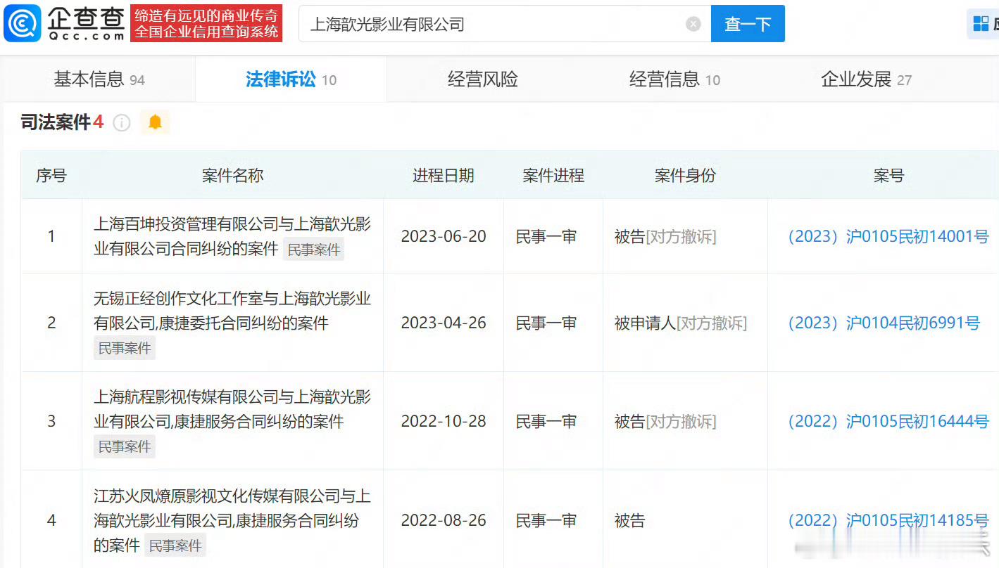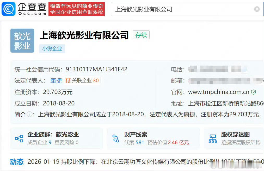 据企查查App显示,上海歆光影业有限公司成立于2018年8月,注册资本约29.7万人民币,经营范围包括电影制片、组织文化艺术交流活动、市场营销策划等,由康捷、上海歆影企业管理有限公司、广西腾讯创业投资有限公司等共同持股。法律诉讼信息显示,该公司曾多次因委托合同纠纷、服务合同纠纷等被起诉。
