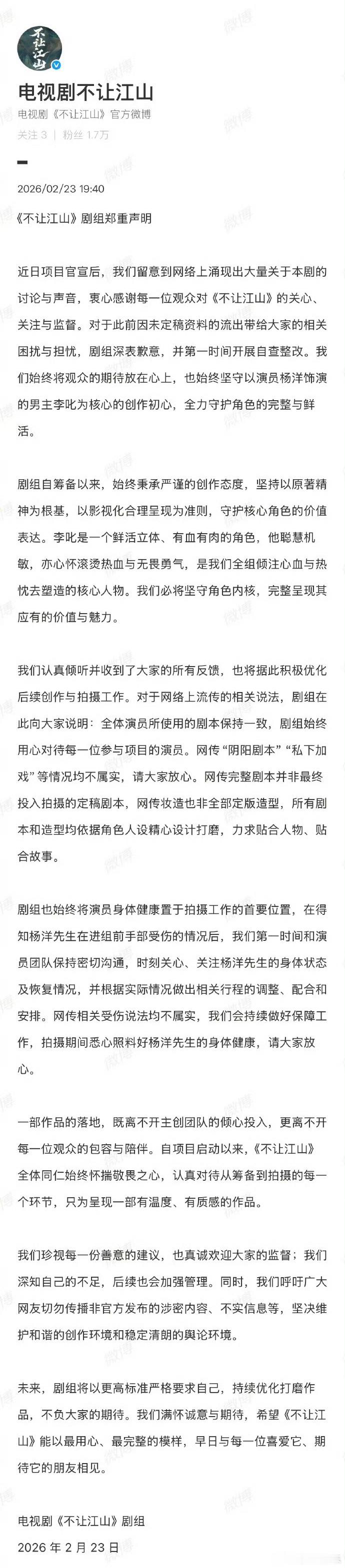 不让江山出品方涉多起纠纷不让江山剧组声明23日,《不让江山》剧组发布声明回应近期争议,否认存在网传“阴阳剧本”“私下加戏”等情况,引发热议。公开信息显示,《不让江山》出品方包括深圳市腾讯视频文化传播有限公司、上海歆光影业有限公司、明日传奇影业(东阳)有限公司。