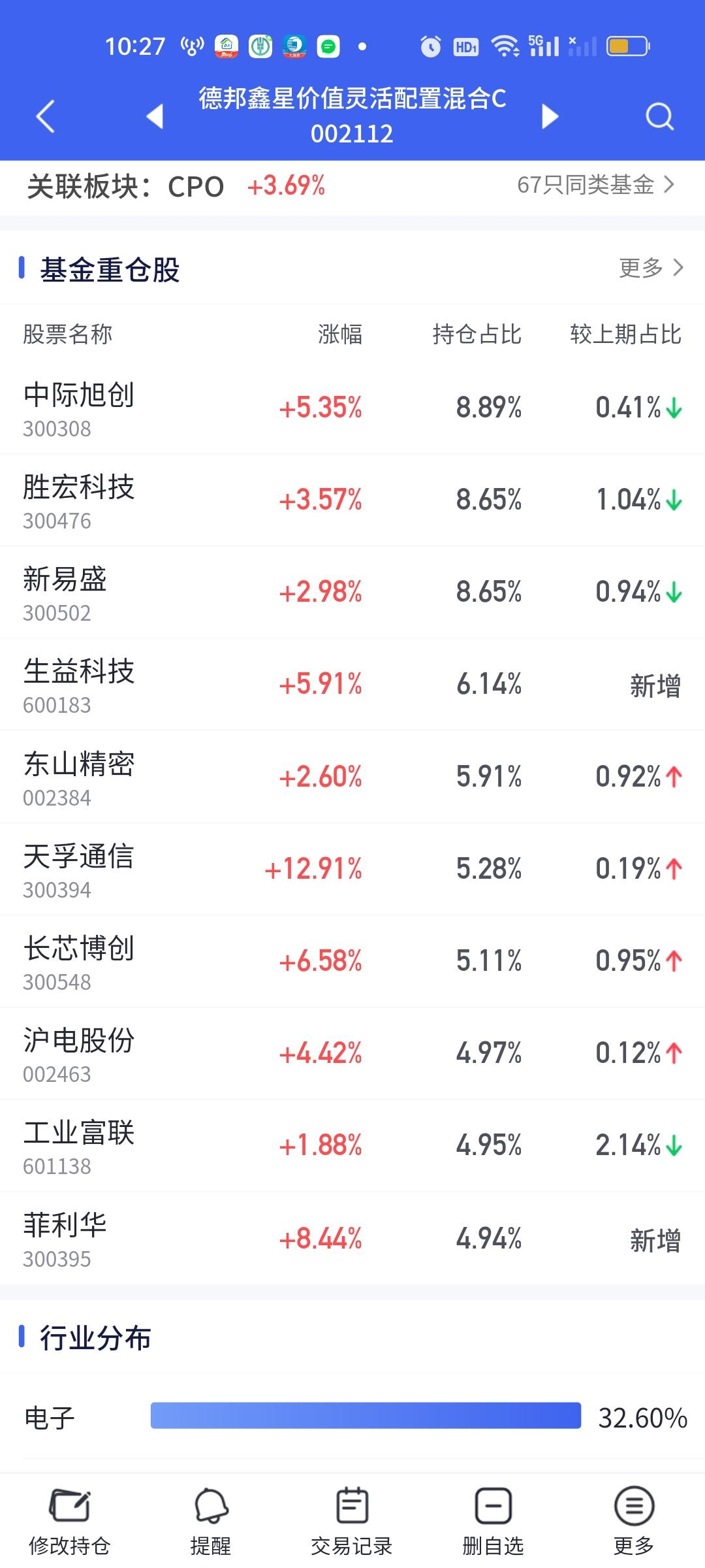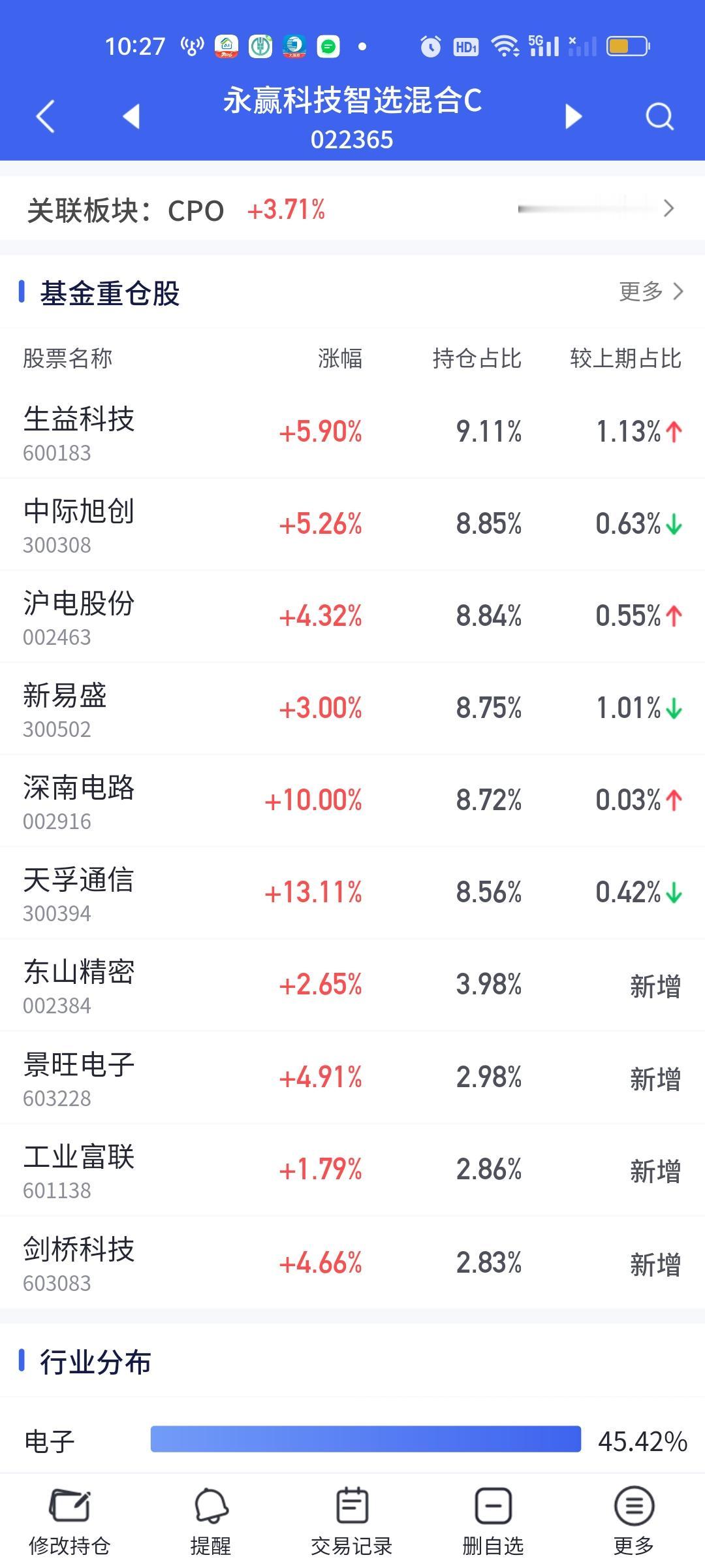 今天手里重仓CPO板块的兄弟们可能会笑不拢嘴了。开盘还不到半个小时,普遍涨幅已经接近5%,如果下午可以有资金继续流入,那涨幅还有可能继续扩大。我拿了一点科技智选和长安宏观策略,跟着喝点肉汤,再次恭喜重仓拿着CPO的好兄弟们。