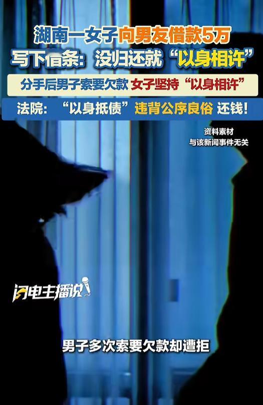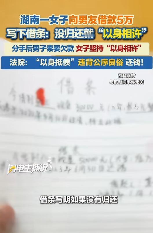 “离了个大谱!”湖南,一女子恋爱时,向男友借了5万块钱,为了证明自己会还,女子还写了借条,只不过在后面写明如果还不上自己就以身相许,分手后,男友索要欠款,可女子却表示自己没钱,坚持要以身相许!网友:分明是不想分手! 湖南益阳一起恋爱借款纠纷,在网上吵得挺热闹,起因是一张写着“以身相许”的借条。 事情的主人公是刘强和李茜,两人是通过相亲平台认识的,年纪差不多,聊得也投缘,从线上聊天慢慢转到线下见面,没相处多久就确定了恋爱关系。 就在这段甜蜜期里,李茜因为个人资金周转不开,找到了刘强,想向他借5万元钱。 正处于情到浓时的阶段,刘强二话没说就答应了,李茜觉得光口头答应不够,就亲笔写了一张借条。 借条上除了写明借款金额5万元,还加了一句让人意外的话,说如果到时候没还清这笔钱,她就自愿以身相许嫁给刘强,这笔借款也自动当成刘强给她的彩礼,借条在刘强转完5万元后就生效。 刘强那时候被感情冲昏了头脑,也没仔细琢磨这句话的不妥,觉得就是情侣间的甜蜜承诺,按着约定给李茜转了5万元。 可谁也没想到,这份看似甜蜜的恋情,并没有维持太久,仅仅过了几个月,两人就因为各种矛盾吵得不可开交,最后只能无奈分手。 感情没了,可借出去的钱总得要回来,刘强先是试着通过微信和电话,多次找李茜催要那5万元借款。 让他没想到的是,李茜的态度特别坚决,不仅不肯还钱,还说自己愿意按着借条上的约定来,随时可以和他去民政局领证结婚。 刘强一下子就懵了,他从来没把那句“以身相许”当真,当初借钱也只是想帮李茜渡过难关,如今两人都分手了,怎么还能拿婚姻来抵债务。 他和李茜反复协商,可李茜始终不肯松口,一门心思要履行所谓的“约定”,还说这笔钱已经变成了彩礼,根本不用还。 协商了好几次都没有结果,刘强实在没辙了,只能拿着那张写着“以身相许”的借条,把李茜起诉到了益阳市赫山区人民法院,要求她偿还全部借款。 法院开庭审理的时候,李茜依然坚持自己的想法,辩称自己愿意嫁给刘强,按约定履行承诺,借款已经转化成彩礼,她不应该承担还款义务。 而刘强在法庭上也忍不住吐露心声,他觉得李茜的做法特别荒唐,婚姻怎么能当成抵偿金钱债务的工具,这简直就是把婚姻当成了买卖。 这起案件之所以特殊,就是因为那张奇葩的借条,而背后折射出的,也是当下不少情侣在恋爱中的一个常见问题,就是容易把感情和金钱混为一谈。 很多人在恋爱甜蜜期,总觉得彼此是要过一辈子的人,不分你我,涉及到金钱往来时,要么不写凭证,要么就像刘强和李茜这样,写下一些不符合法律和公序良俗的约定。 他们以为这是甜蜜的承诺,却忽略了感情是会变的,一旦两人分手,曾经的甜蜜约定,就可能变成扯不清的麻烦,甚至会闹到对簿公堂的地步。 法院经过仔细审理后,也给出了明确的判决,认定借条中“以身相许”抵偿债务的约定,违背了社会公序良俗。 虽然“以身相许”的约定是无效的,但这并不影响两人之间基础的借贷事实,所以她必须履行还款义务,最终,法院判决李茜偿还刘强全部5万元借款。 这起纠纷的根源,就是情侣在恋爱期间,没有处理好感情和金钱的边界。 恋爱时的甜蜜是真的,想要帮助对方也是真的,但金钱往来还是要保持清醒,不管感情多好,涉及到大额借款,都应该写清楚正规的借条,明确款项性质,不要添加任何不符合法律规定的奇葩约定。