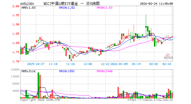 2月24日,截止午间收盘,MSCI中国A股ETF基金(512360)涨0.77%,报1.834元,成交额48.67万元。MSCI中国A股ETF基金(512360)重仓股方面,贵州茅台截止午盘跌0.92%,宁德时代跌0.48%,招商银行涨0.67%,工业富联涨1.94%,中国平安跌0.75%,紫金矿业涨4.16%,长江电力涨0.15%,中际旭创涨6.27%,农业银行跌0.31%,寒武纪跌3.27%。
