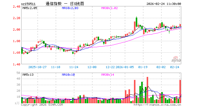 2月24日,截止午间收盘,通信ETF南方(159511)涨2.81%,报2.083元,成交额7785.28万元。通信ETF南方(159511)重仓股方面,新易盛截止午盘涨3.68%,中际旭创涨6.27%,中兴通讯涨1.21%,中国电信涨0.88%,天孚通信涨13.97%,中国移动涨2.02%,中国联通涨1.25%,分众传媒跌1.24%,巨人网络跌4.69%,中天科技涨7.08%。