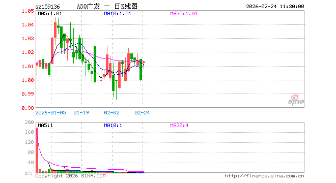 2月24日,截止午间收盘,A50ETF广发(159136)涨1.30%,报1.013元,成交额78.94万元。A50ETF广发(159136)重仓股方面,宁德时代截止午盘跌0.48%,贵州茅台跌0.92%,中国平安跌0.75%,中际旭创涨6.27%,招商银行涨0.67%,紫金矿业涨4.16%,美的集团涨1.06%,长江电力涨0.15%,立讯精密涨0.89%,中信证券涨0.22%。