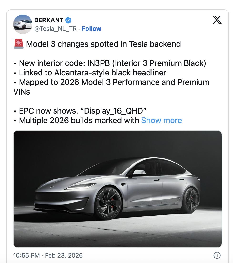Model 3将迎来重大升级 特斯拉正在对Model 3进行两项重大升级,其中一项是车主和粉丝们强烈要求。有用户在推特上发文,根据在欧洲和中国配置器中发现的代码,特斯拉计划进行两项重大升级:黑色车顶内衬和全新的16英寸QHD显示屏,类似于Model Y Performance上的那款。 这些变化令人期待,特斯拉车迷一直呼吁Model 3和Model Y车型配备黑色车顶内衬,因为即使选择黑色内饰,车顶内衬仍然是灰色的,感觉不够协调。 特斯拉一直在通过一些车主期待的小升级来提升Model 3和Model Y的关注度,而随着Model S和Model X等其他车型的逐步淘汰,Model 3也成为了公司未来计划的重点。【来自懂车帝车友圈】