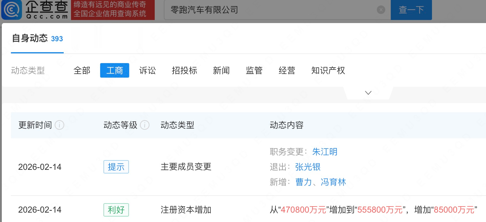 企查查APP显示,近日,零跑汽车有限公司发生工商变更,注册资本由47.08亿人民币增至55.58亿人民币,朱江明由执行董事改任董事,同时,多位高管发生变更。企查查信息显示,该公司成立于2017年,由零跑汽车(09863.HK)全资持股。