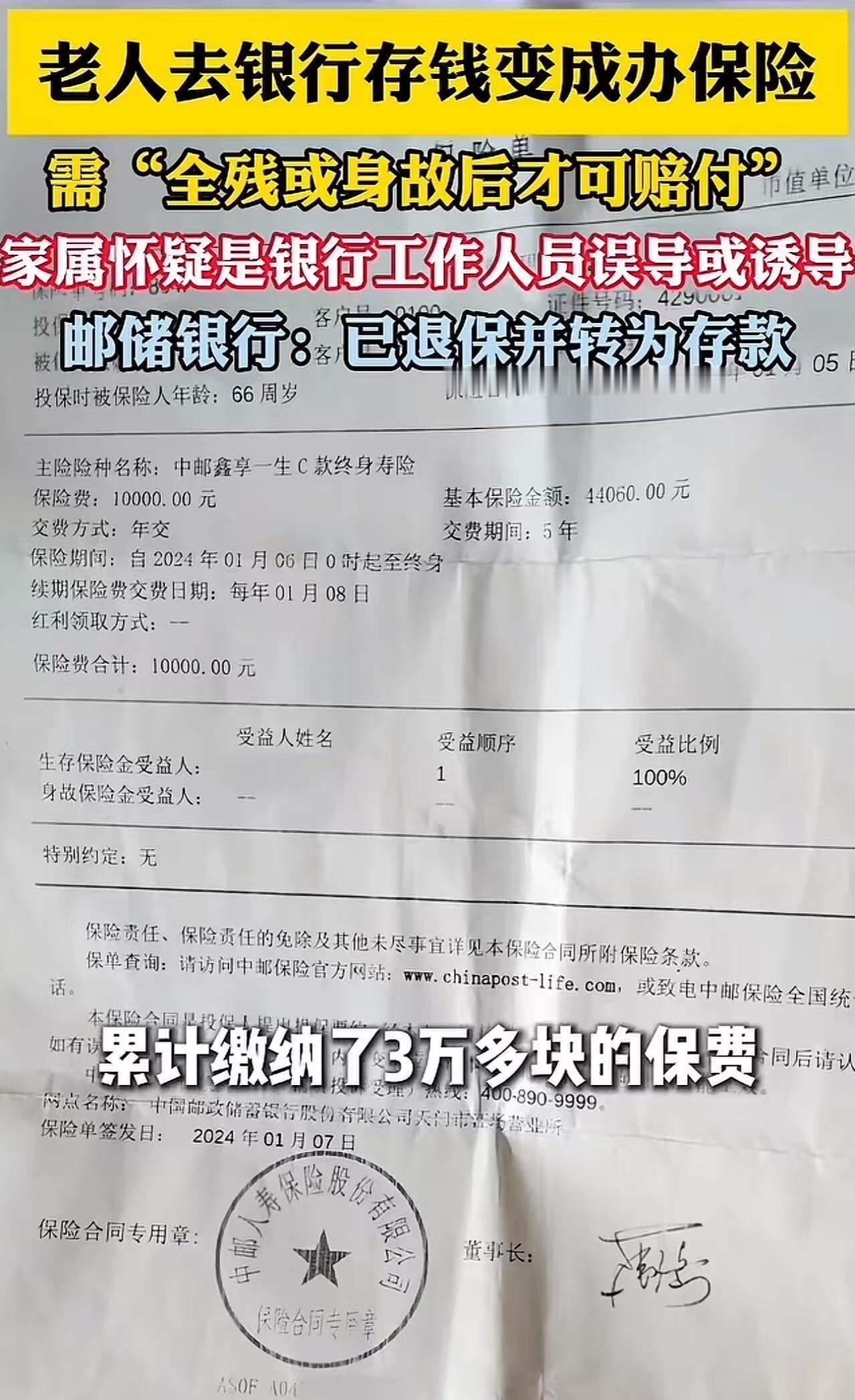 老人去银行存钱却变成办保险,需“全残或身故后才可赔付!”老人儿子:“怀疑是工作人员误导或者诱导!这还有职业道德吗?”网友:这难道不是诈骗吗?退钱就完了吗? 这样的新闻一出现,立刻引爆社交网络,激起千层浪。试想,一个本该安心存款养老的老人,满怀信任地走进银行,却被推销成一纸复杂的保险合同,理赔条件苛刻到“全残或身故”才能赔付,这究竟是服务的失职,还是道德的沦丧?更令人愤慨的是,老人的儿子怀疑这是工作人员的误导甚至诱导行为,质问银行“这还有职业道德吗?”而网友们的反应更是直指本质,质疑这是否已经触及诈骗的法律红线。 我们不得不问,这背后到底隐藏着怎样的行业乱象?银行作为金融服务的窗口,本应是守护客户利益的坚实堡垒,怎么会沦为某些销售人员谋取私利的工具?这不仅仅是一次简单的误导,更是对老人信任的无情践踏。老人们日复一日辛苦积攒的血汗钱,本该被妥善管理和保护,结果却被包装成“保险理财”花样翻新,拖入一场看似保障实则陷阱的泥潭。 更深层次来看,这反映出当前部分金融服务业态中,销售压力与利益驱动如何扭曲了服务本质。为了达成业绩指标,部分工作人员不惜将本应清晰透明的产品复杂化,用晦涩难懂的条款误导客户,尤其是认知能力相对较弱的老年群体,成为他们重点“营销”的对象。这样的行为,实质上是在利用信息不对称,玩弄规则漏洞,严重损害了社会的公平正义。 而我们作为社会的一员,不能对此视而不见。老人儿子的质疑和网友们的愤怒,其实是整个社会对金融诚信的一次强烈呼声。我们需要更多的监管力量介入,推动金融机构真正落实“以客户为中心”的服务理念,同时呼吁每一位消费者增强金融风险意识,避免成为类似事件的受害者。 这起事件也提醒我们,面对金融产品,尤其是涉及资金安全的保险和理财产品,绝不能盲目信任。学会提问,学会拒绝,是保护自身权益的第一道防线。银行和保险公司应当拿出诚意,正视问题,承担起应有的社会责任,切莫让信任变成利益的牺牲品。 你怎么看这件事?你身边有没有类似的经历?欢迎留言吐槽,让我们一起为维护金融诚信发声!存款老人去世 老人取款事件 遗产取款困境 老人取款悲剧 取款老人去世 重疾退保 取款老人