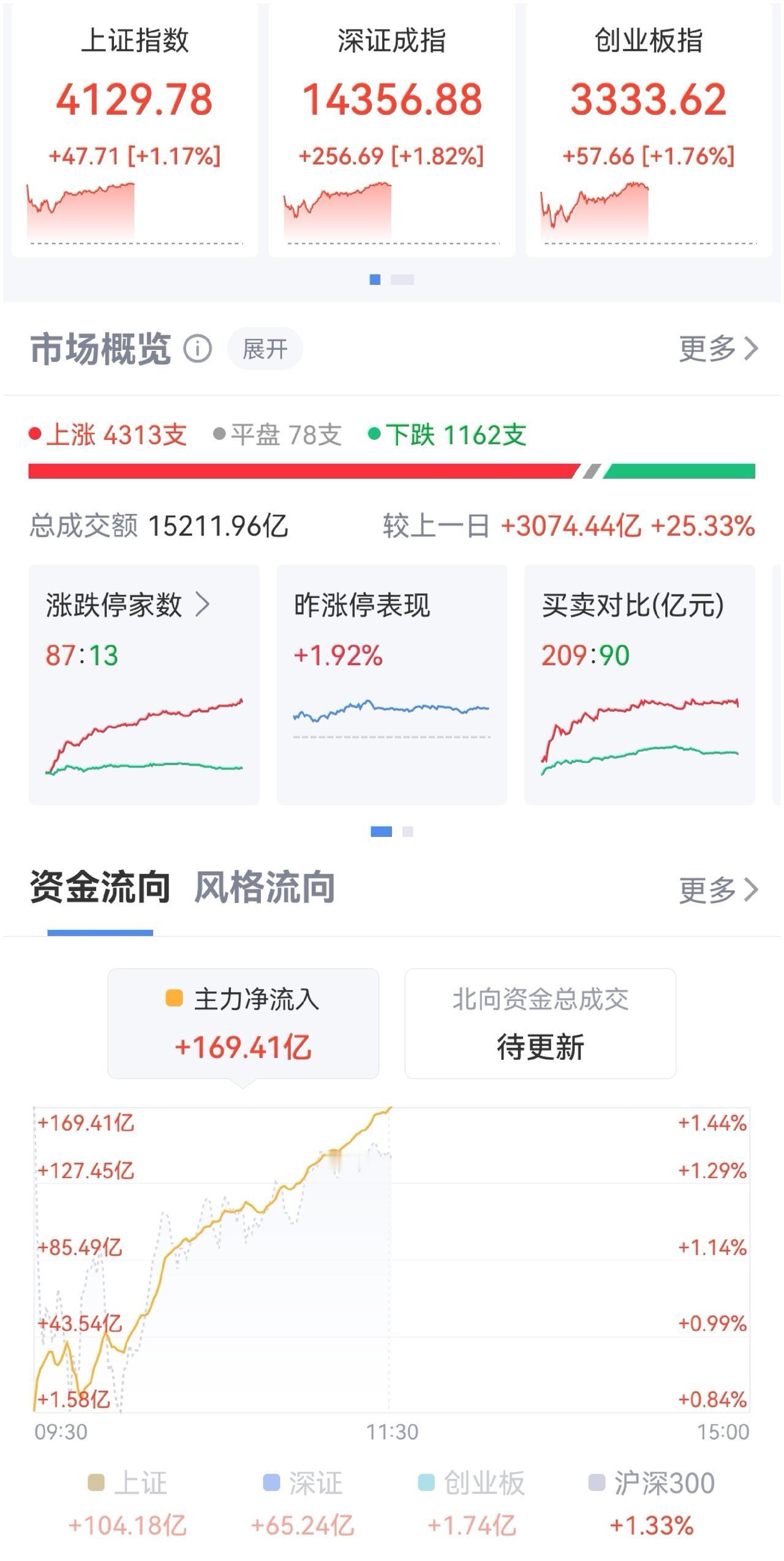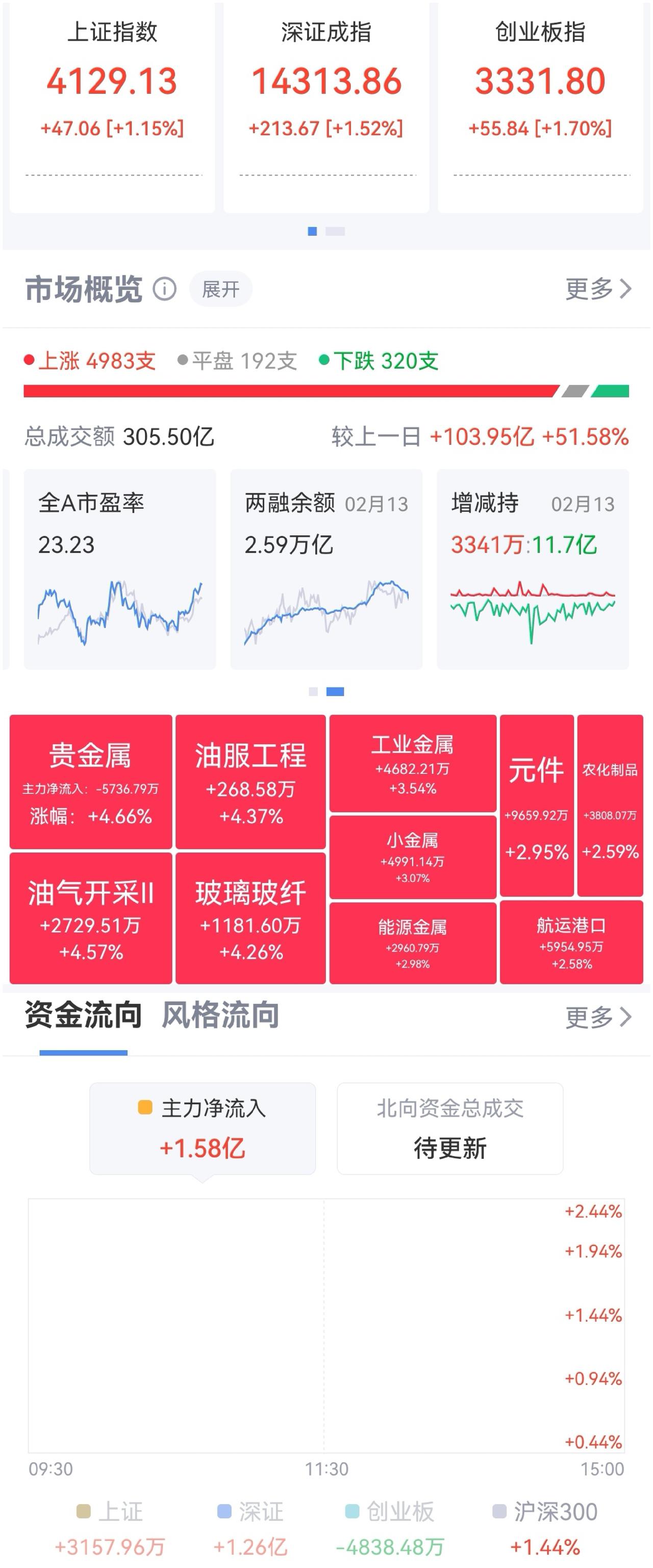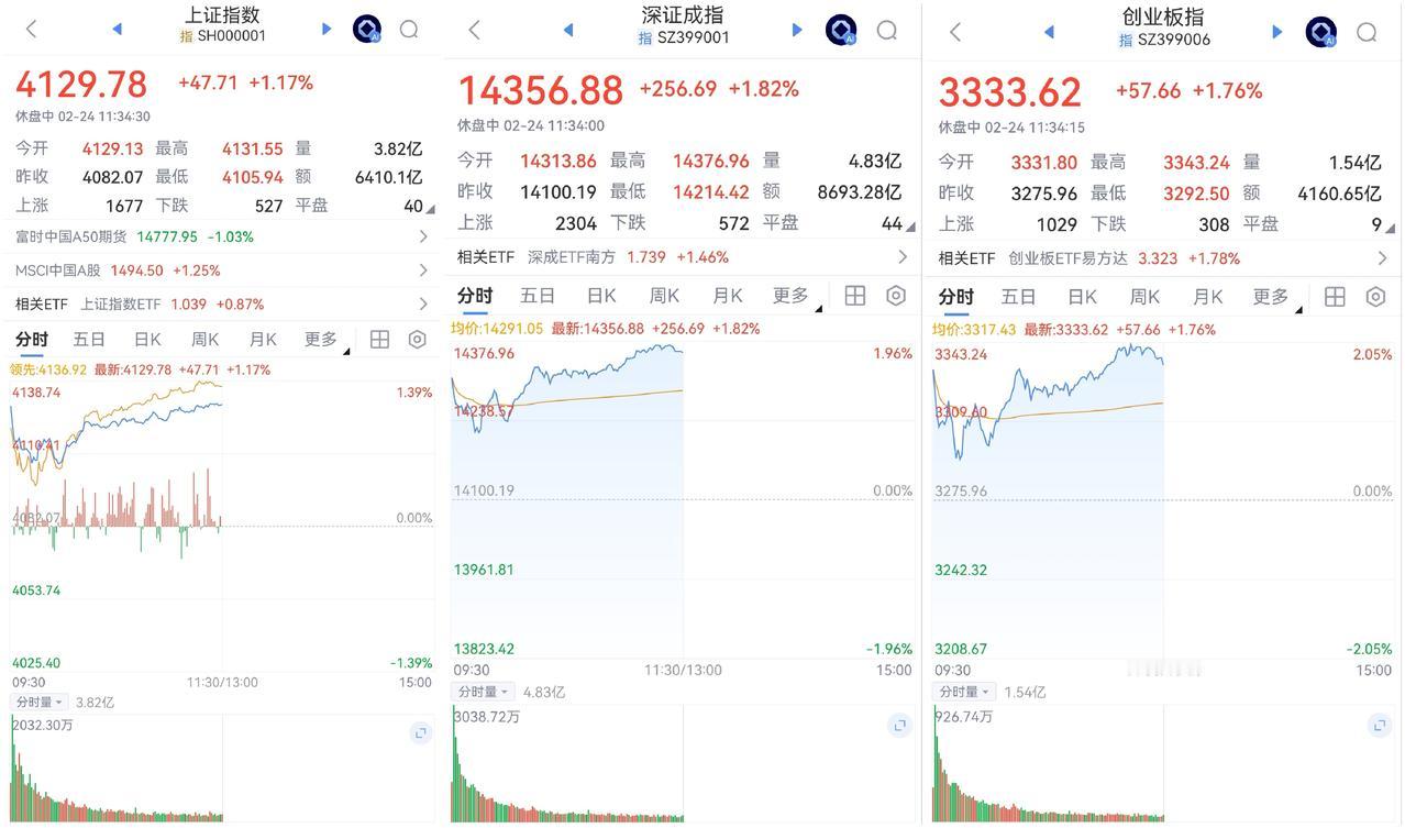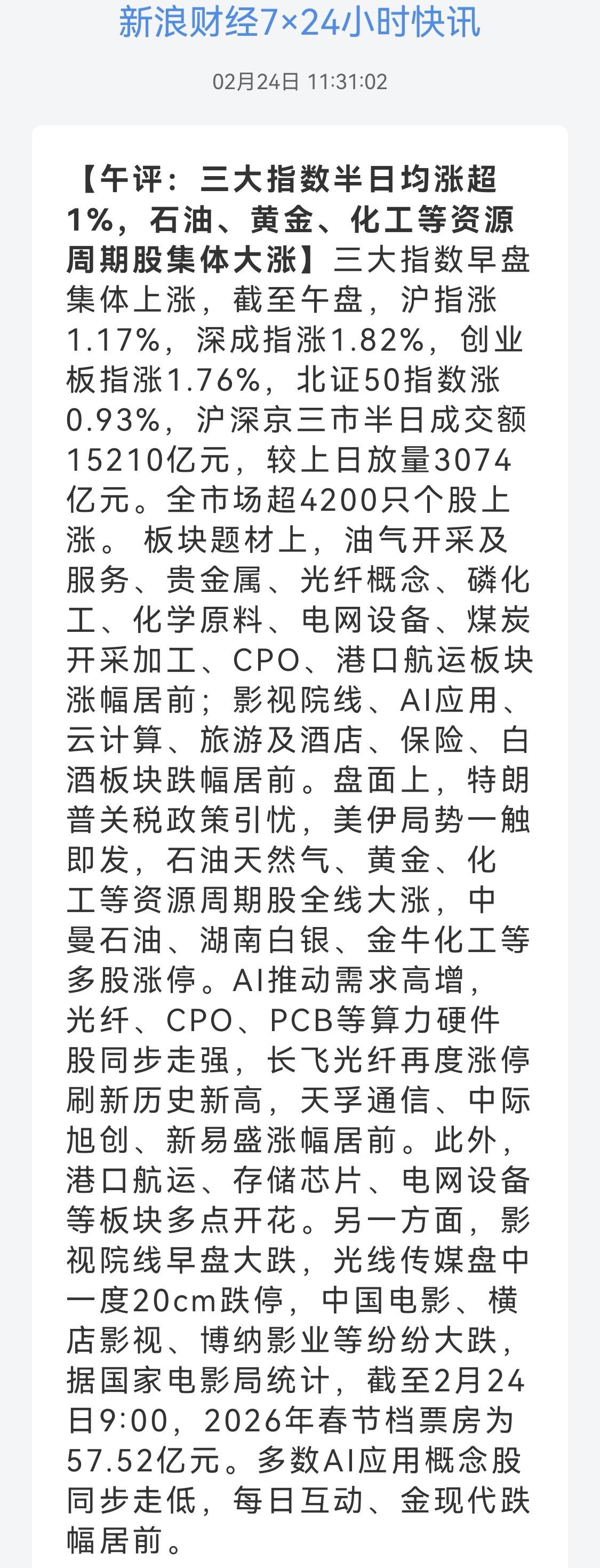 午盘印象(2月24日) 强势震荡 科技未合力 外围:美股下跌 科技多调整 内股:科技分化 CPO强势 大宗强势 一、三大股指大幅高开: 指数开盘强势 个股开盘涨平跌比率91%:3%:6%。 个股开盘均势(+85 Vs -24个百分点), 个股高开极明显 二、早盘指数震荡 高开跳水又回升 半日又超1.5万亿,量能扩张跳水又拉起 三、涨跌幅榜: 科技分化 红利分化负面 跌幅前列:AI应用、算力、消费 涨幅前列:大宗、CPO和PCB、有色、化工 四、开盘和午盘: 开盘:沪+1.15%、深+1.52%、创+1.70%。 午盘:沪+1.17%、深+1.82%、创+1.76%。 高开震荡 五、午盘个股上涨近78%,与昨日涨跌差距( +57 Vs -2个百分点),大幅扩散 相比开盘,涨跌差缩减,下跌个股增长较大 资金+169 ( -361)亿,资金年后又回流 六、沪深两市成交量午盘15,103亿,上个交易日12,039亿,同比量能扩张近3,100亿,节后资金回流,量能放出。 七、指数中阳,个股普涨 融资额12天10降、年前交易日-570亿,最后一天下跌,两融避险主因。 大幅高开,又逢港股回调,稍显犹豫,未能延续开盘强势 午后两种情形: 1、横盘震荡:贸易格局变化中,谨慎乐观,震荡消化,时间换空间。 2、震荡上涨:避险资金回流,反弹力度加强,慢牛格局未变。 (图片源自网络侵权告知删除)