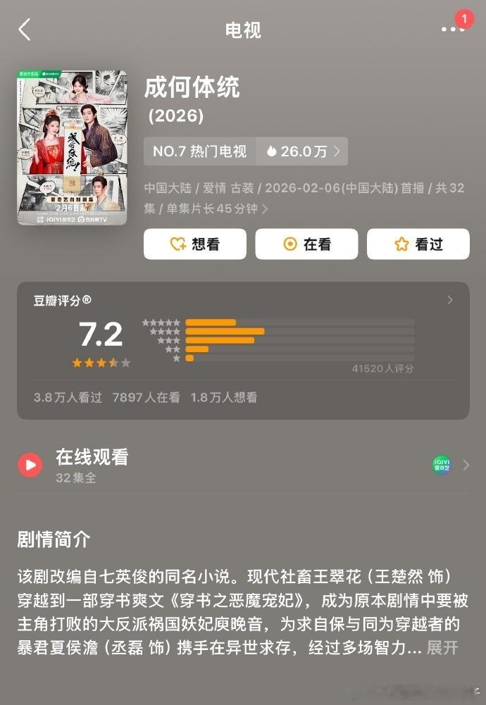 成何体统豆瓣评分7.2王楚然丞磊成何体统豆瓣开分7.2分《成何体统》豆瓣评分7.