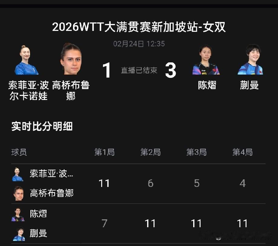 陈熠和蒯曼打女双,弹幕都是雨果媳妇加油。 不知道这些人是什么心理,应该就是不希望陈熠赢。 其实陈熠赢过很多人,竞技比赛输赢很正常,一些人从去年开始就和陈熠过不去。 我经常会发陈熠比赛,评论区就是有一部分人不看好她,怎么做都不对,从身高到发球到情商,最不可理喻的还说是走后门。 其实陈熠从去年美国大满开始,大半年世界排名上升到第八,这可是陈熠一拍一拍打出来的,世乒联只认比赛成绩吧。 对一个小将应该有包容之心,都是为国争光,都是为国乒效力,理应得到支持和肯定。 陈熠和蒯曼让一些人失望了,3-1拿下比赛晋级,雨果媳妇淘汰了。 陈熠和蒯曼加油,女双打出好成绩。 图片来自网络侵权可删。