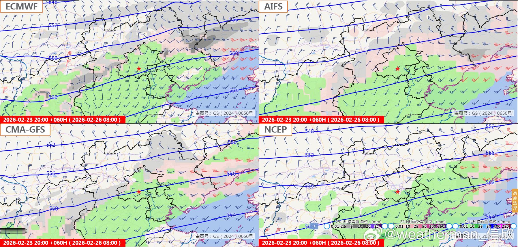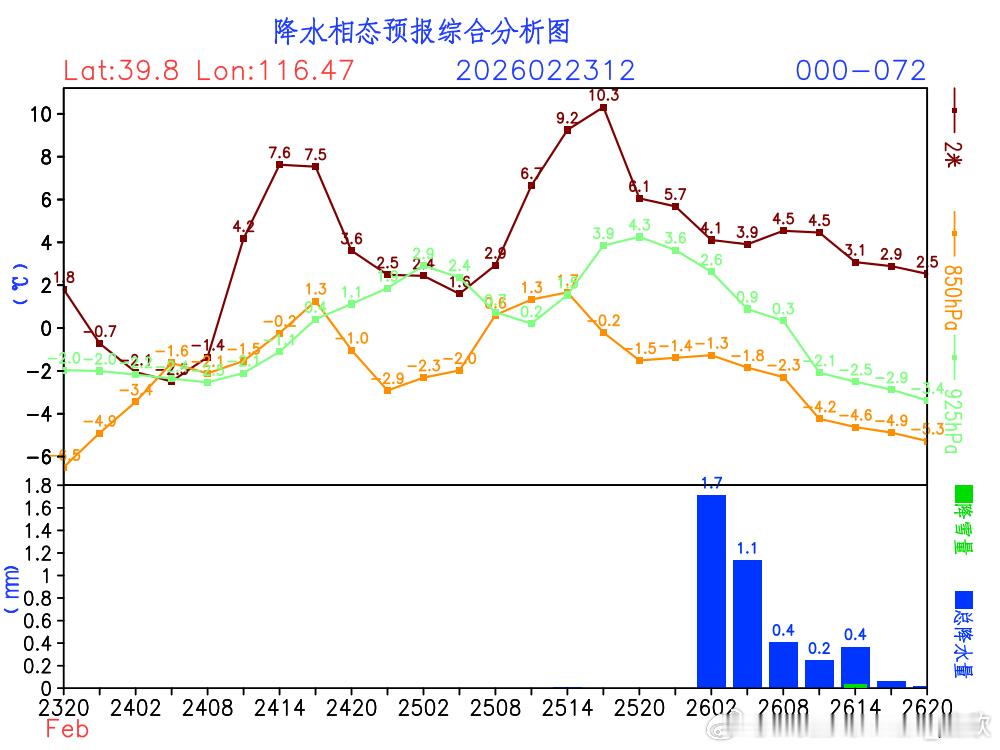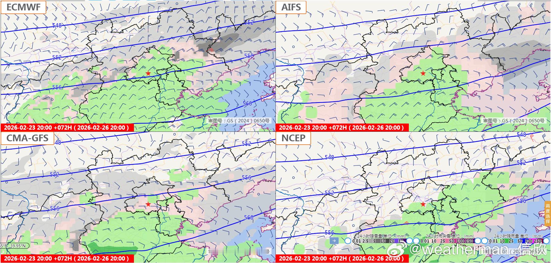 图2为数值预报的25日08时-26日08时的降水对比,北京西北部山区有雪,城区为降雨。图3为25日20时-26日20时的降水对比,我国CMA模式给出了部分城区也可能有雨夹雪。从图4-6的单点预报看,26日02-14时期间,降水机会大,14时低空温度降至最低,处于雨雪临近,0℃层可能短暂低于300米。26日早晨根据实况观测与数值预报对比,来确认到底能不能下雪。