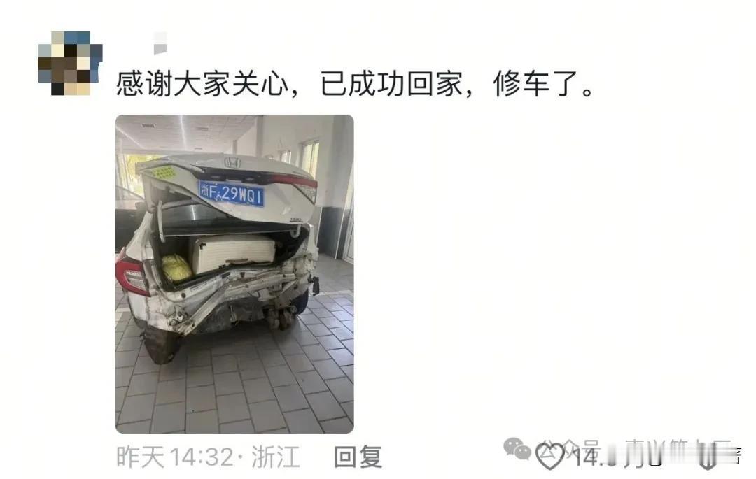 返程名场面!嘉兴一辆“破车”彻底火了?好多人拍到,再难也要回嘉! 这几天,返程已经达到高峰, 不是在堵车就是在赶路! 没想到, 嘉兴有一辆汽车火了, 身残志坚、多远都要回嘉! @第九区网友爆料: 嘉兴这辆浙F29WQ1彻底火了? 好多人在路上拍到! 整个汽车撞得破旧不堪, 车尾敲开成翅膀状、引擎盖掀起, 身残志坚,哪怕只剩半幅车身, 家在嘉兴,再破也要开回去! 没想到还有结局, 已经安全到嘉兴,修车中! 这大概是返程最硬核、最戳人的嘉兴车牌。 车可以破,嘉必须回!