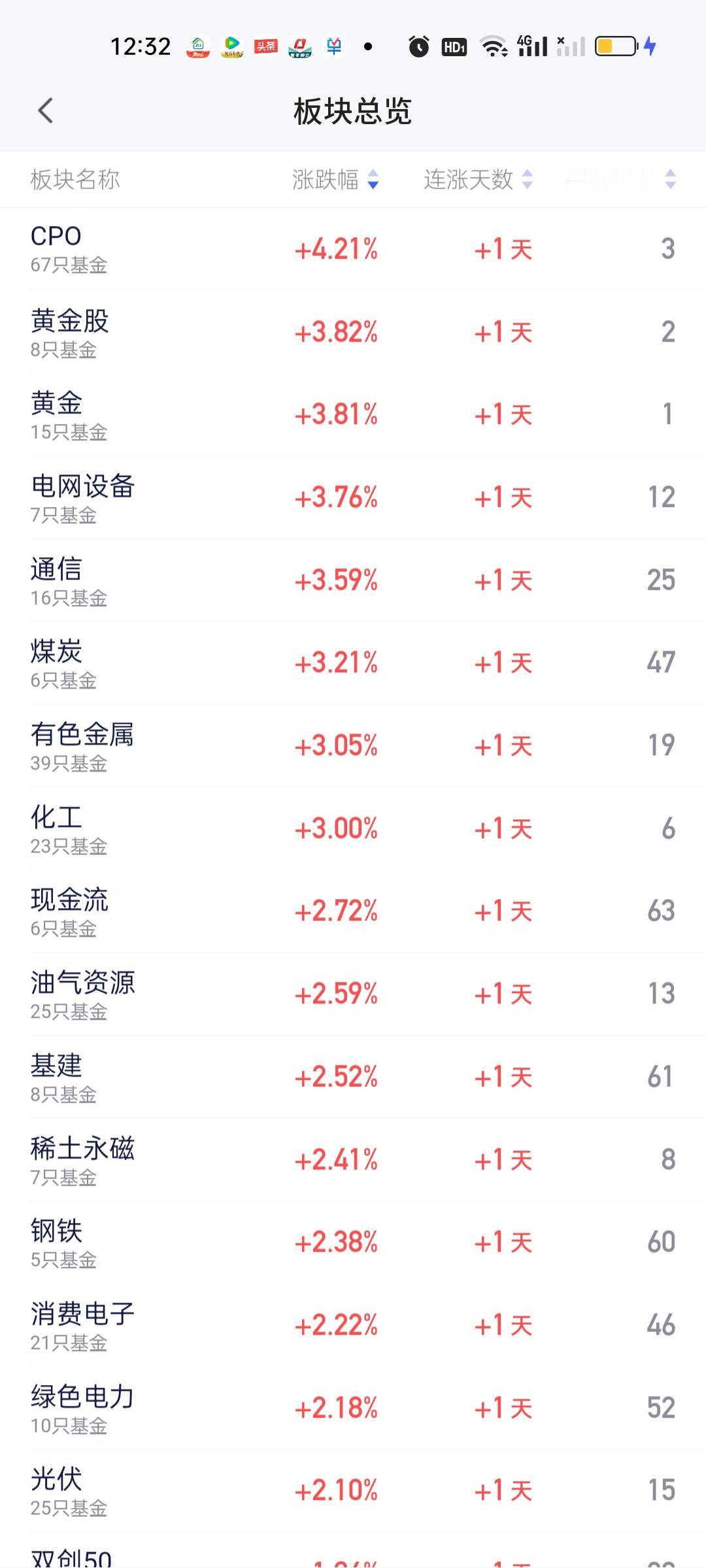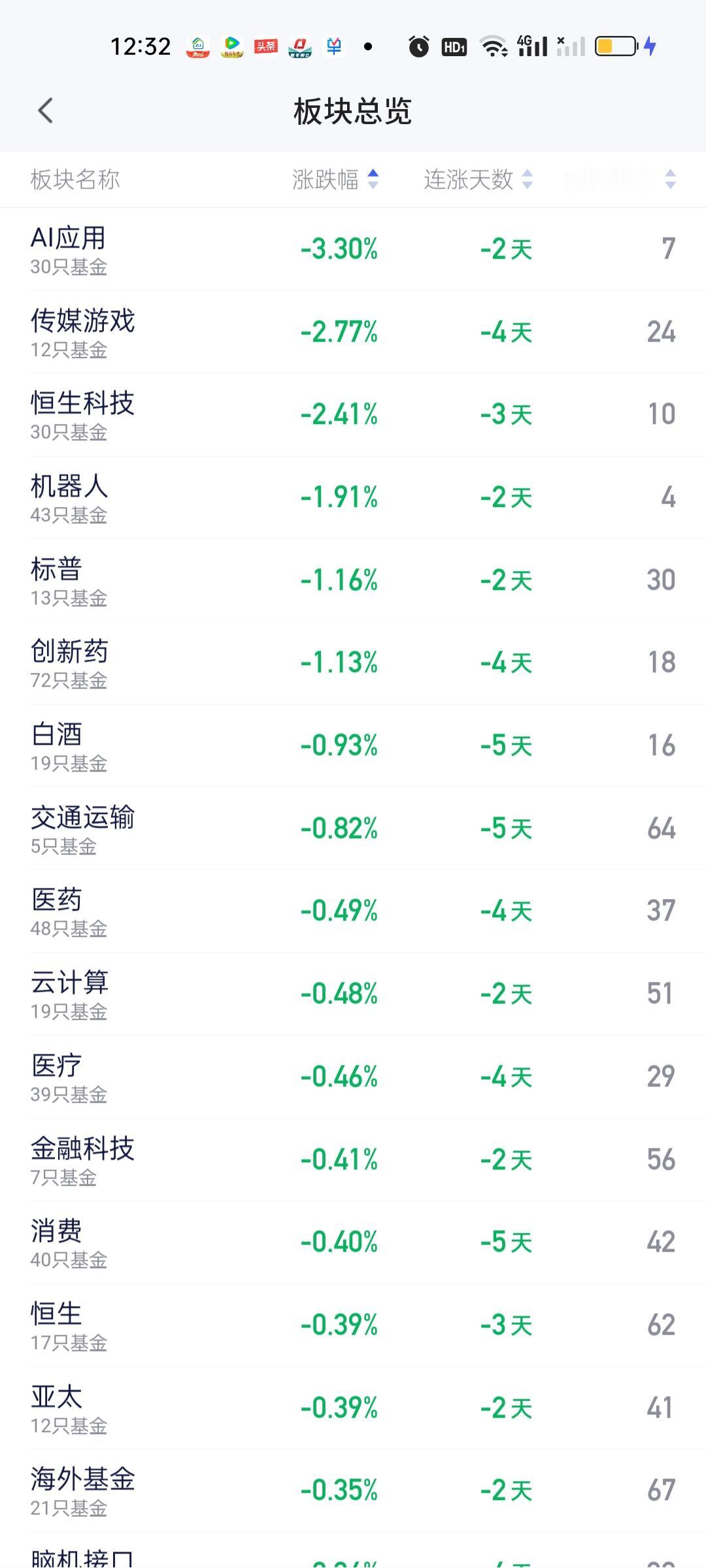 今天上午尽管大盘涨得很好,但还是有一些板块的跌幅比较大!涨幅靠前的是CPO,黄金,电网设备,通信,煤炭,有色金属,化工等板块。跌幅靠前的是AI应用,传媒游戏,恒科,机器人,创新药,白酒等板块。 AI应用今天的跌幅比较大,另外港股创新药,恒科今天也是,从纯操作的角度讲可以做一下高低切,从涨得比较好的CPO和通信板块转换到跌的比较多的AI应用和恒科等。看下午的情况再说。
