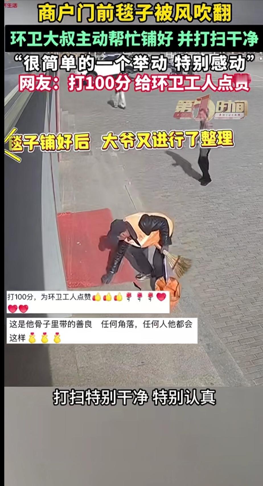 感动就是一个简简单单的动作!今年春节期间,内蒙一女子关店回家,期间因风大将门前的垫子给吹翻了,这一情况并不被女子知晓。几天前,女子无意中打开监控一看,意外发现了令她感动的画面。网友:感动不在于钱多钱少,一个简简单单的动作便可。 女子姓石,在鄂热多斯开了一家店,平时生意也不错,快到过年时当地许多人回了家,店里可谓是门可罗雀,石女士也只好老早关门,回家陪陪父母和孩子。 前几天,女子不经意间看开监控看了看,可这不看不知道,一看惊一跳,监控里出现了一个环卫工大叔,刚开始大叔在清扫门口附近的垃圾,一转眼看到石女士店门口的地毯翻了也斜了,大爷便把扫把放在另一只手中,用这只手开始铺地毯,铺完又整了整,看地毯整齐后大爷又将毯子上的灰尘垃圾一一清扫,随后消失在监控中。 而大爷这个朴实无华且简简单单的动作,让监控另一头的石女士非常感动,石女士觉得不能让好心人埋没,于是她立刻联系了环卫工所在的公司。 将监控中发生的一切告诉给公司,公司表示要好好表扬这位环卫工大叔。不仅如此,石女士也送上了她的心意。这个视频一经发布,很快受到了网友们的关注。 有人表示,最平凡的大爷干着最平凡的事,却让女子收获了最不平凡的感动。 有人感慨,感动就是一个简简单单的动作,它不在于钱多钱少,话多话少,只要你真心做了,换来了自然是意想不到的收获。环卫工虽然平凡,可他做的事一点都不平凡。生活中,总会有这样的人,不经意间将温暖送给别人,这比黄金还珍贵。 我深信,和环卫工大叔一样的人有很多,只是没有被发现而已。她们干着最辛苦最不起眼的事,却净化着每个人的内心。类似这样正能量的事迹,理应多分享才对。