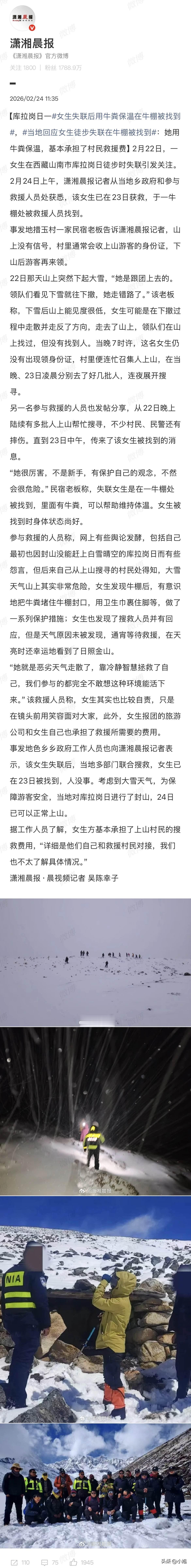 家人们谁懂啊?西藏库拉岗日雪山,一个女生跟团徒步,下大雪走散了,在山上失联一整夜。 山上温度零下十几度,风刮得跟刀子似的。 所有人捏了一把汗,觉得这下悬了。 结果呢?这姑娘硬是靠着一棚子牛粪,把自己给救了。 事情是这样的。2月22号,她跟着旅行团上山。那天天气不好,突然下起大雪,领队经验足,一看情况不对,赶紧带着大家往下撤。 雪太大,山上白茫茫一片,几米外就看不清人。 她一脚踩错,没跟上队伍,走反了方向,往山里面去了。 领队发现少人的时候,已经晚了。在山上找了一圈,没找到。 山下村子里有个规矩,游客上山前要把身份证押在民宿,下山回来再取。 等到晚上7点,这姑娘还没来领身份证。 村里人心里咯噔一下:坏了,出事了。 村民们二话不说,抄起手电筒就往山上冲。派出所民警也去了。 那路根本没法走,全是雪,滑得要命。有个交警大哥穿着皮鞋,在山上爬上爬下,摔了不知道多少跤,看着都心疼。 第一批人找到半夜,没找到。 第二批人凌晨又上去,还是没找到。 直到23号中午,终于传来了消息:人活着,在一个牛棚里找到了。 这姑娘后来跟救援人员讲了她在山上的一夜。 下午4点多,她路过一个废弃的牛棚。后来发现走错路,她就顺着自己的脚印,又摸回了那个牛棚。 进去一看,地上有干的牛粪。 换一般人可能嫌脏,躲都来不及。她没嫌。 她蹲下来,把那些牛粪一块块捡起来,把牛棚漏风的窟窿眼全给堵上。 然后她穿上雨衣保暖,把剩下的牛粪往自己身上盖。 她包里带着卫生巾,拿出来裹在脚上。脚要是冻坏了,人就真走不了了。 晚上她看见山里有灯光,那是搜救队在找她。她拼命喊,嗓子都喊哑了,可是风太大,声音传不出去。 她没绝望。 每隔一小时,她就看一眼时间,从包里掏出一点路餐,慢慢吃下去,保持体力。 她不敢睡。这种天气,睡着了可能就醒不过来了。 她就这么熬着,熬了一整夜。 天亮的时候,她居然还看到了日照金山。 那一刻她心里特别平静,觉得这趟没白来。 23号中午,救援队终于找到了她。把人带下山的时候,她精神状态还挺好,还跟救援人员合了影。 照片里她笑着,结果网上有人开始骂:浪费公共资源,凭什么笑? 参与救援的人看不下去了,站出来说话:你们知道个啥?她私下里自责得不行,没人的时候整个人都蔫了。那种环境下能活下来,靠的是冷静和智慧,不是谁都能做到的。 还有一个大家关心的事:救援费谁出? 乡政府的人说了,这次上山搜救的村民,费用基本都由她和旅行团承担了。具体多少钱?有消息说是3万左右。 钱是一回事,命是另一回事。 有人说她运气好,碰巧有个牛棚。 可那晚牛棚不止她一个人路过,只有她活下来了。 把牛粪当建筑材料堵墙,盖在身上保暖,用卫生巾包脚,一小时醒一次不敢睡——这不是运气,这是在拿命换经验。 也有老徒友说,如果她再晚半小时发现走错路,如果那个牛棚再远五百米,如果她慌了神往山沟里钻,结局就不是这样了。 这事在网上吵了一天。 有人骂她不听劝乱跑,有人说她是教科书式自救。 你觉得呢?是命大,还是真本事?