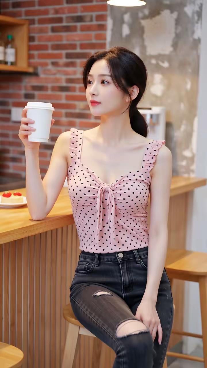 悠闲下午茶时光,甜美波点上衣搭配牛仔裤,享受咖啡的惬意。