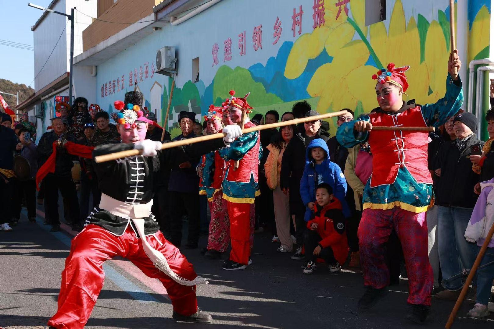 在密云区溪翁庄村文化广场,文化展演、年味市集、游园互动三大板块联动发力,好戏连台。文化演出环节,《马踏山河》鼓乐铿锵、马旗飞扬,古彩戏法变幻莫测,川剧变脸喷火惊艳全场,京韵大鼓、河北梆子等传统曲艺轮番上演、韵味悠长,本土村民与志愿者团队带来的歌舞、戏曲表演,更添乡土温情与团圆气息。智能机器人与传统舞狮队同台互动,老民俗搭配新科技,“土洋”结合解锁别样精彩。