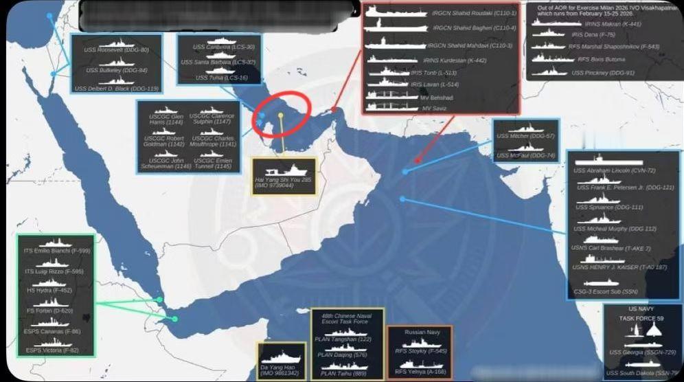 这是美国在伊朗周边部署的各型战舰、航母打击群的最新位置地图。从去年6月份12日战争之后,伊朗的巡航弹,弹道弹,包括自杀式无人机的导航已经全面转向北斗导航系统,伊朗的关键设施附近也都有定位电子干扰系统。 你们看(图一)上红圈,那是东大的科研船"海洋石油285"号(国际 海事组织编号:9739044),它不偏不倚就停在波斯湾中部, 如果美国要打伊朗,它绝对是前排就位,且~从自1月23日起抛锚在此,一步没松。另外, 据东大科技公司提供的卫星照片, 位于巴林的美国海军基地内的濒海战斗舰已全部离港, 同时监测到阿利伯克级驱逐舰正向更有利阵位机动,一切貌似都在按照实战往前推, 但是~回头再看(图一)美国航母的位置,太近了, 这个距离它不会冒险动手的。