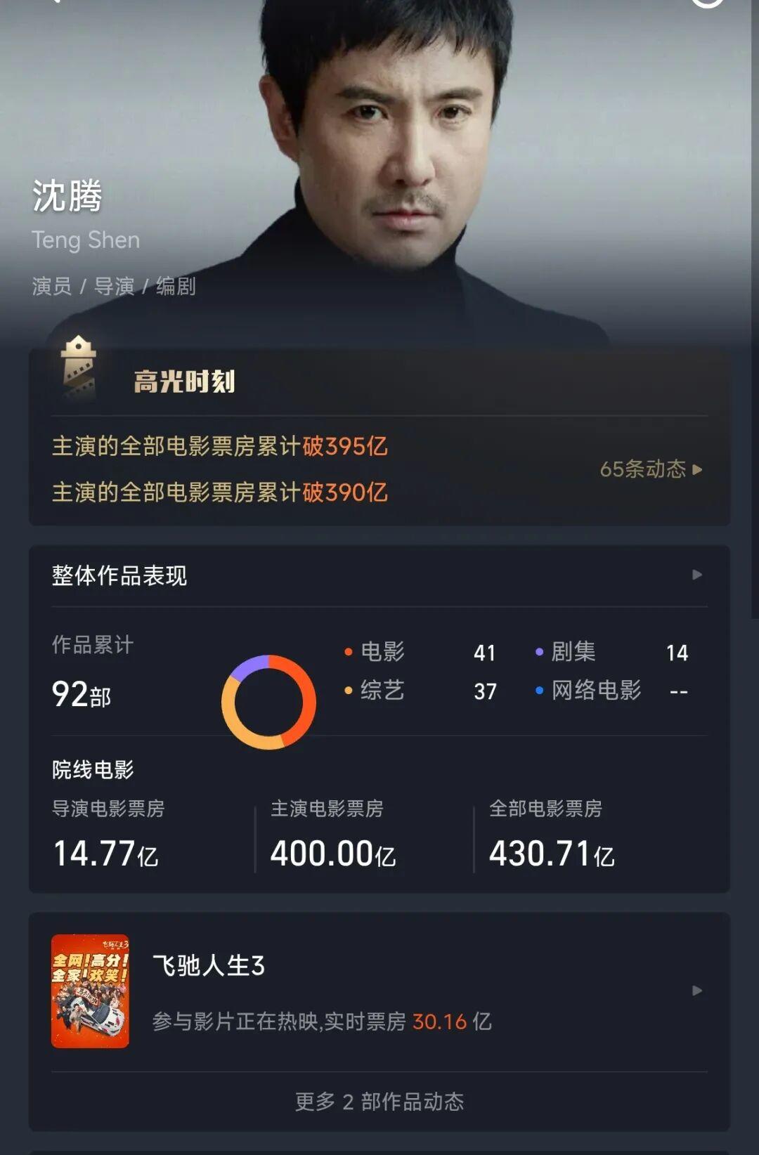 据灯塔消息,截至2026年2月24日14:38,沈腾主演电影共25部,总票房超过400亿,成为首位主演电影票房破400亿元的演员。今年大年初一由沈腾主演的电影《飞驰人生3》,上映八天就收获了30.16亿票房,领跑春节档。
