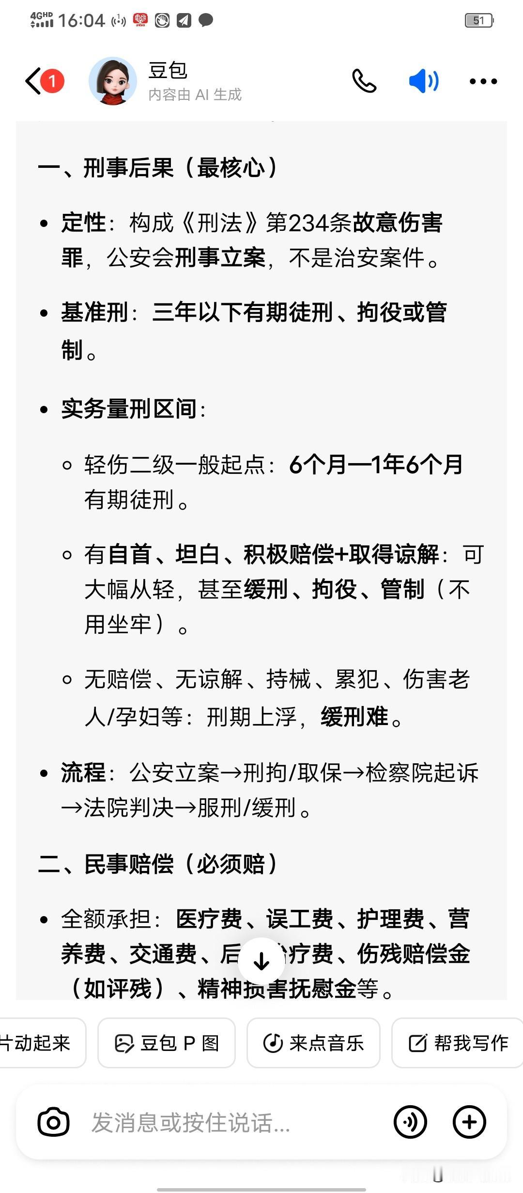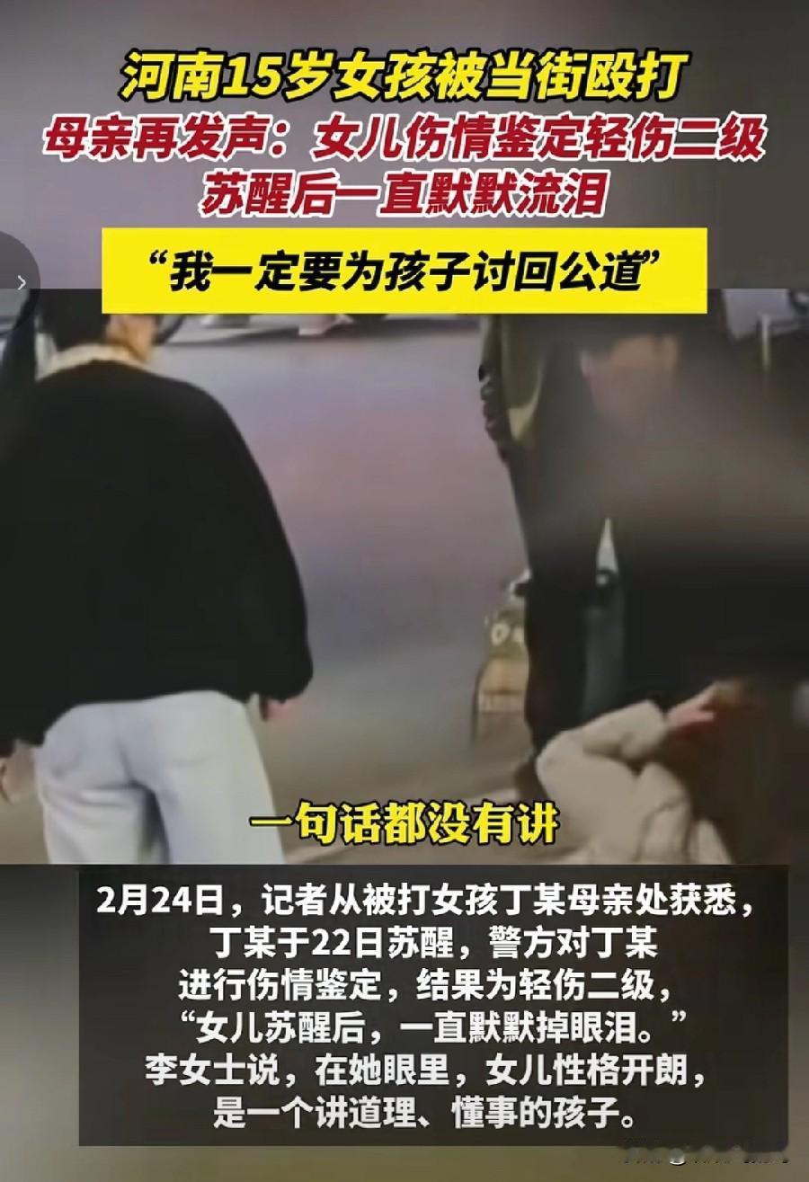 河南15岁女孩被当街殴打伤情鉴定结果出来了。 2月24日,被打女孩的母亲告诉记者,女儿的伤情鉴定为轻伤2级,苏醒后一直默默流泪,表示一定要为孩子讨回公道 , 不管打人者有多大的势力 。 我问了一下豆包 ,将人殴打至轻伤2级,有什么后果 ? 豆包告诉我 ,将人打成轻伤2级,依据《刑法》第234条, 构成故意伤害罪 。法定刑是三年以下有期徒刑,拘役或者管制 。 实务量刑区间(经常)情况是 ,如果对方积极赔偿,加上取得了受害者的谅解,可大幅从轻(常见)缓刑,拘役,甚至不起诉,免予刑事处罚 。 也就是说,如果打人的凶手给予受害者积极的赔偿,加上取得受害者的谅解 ,这个凶手是有可能判处缓刑,甚至免予刑事处罚的 。 河南平顶山这个案件发生于2026年2月19日, 本来就是两辆电动车发生相撞的一个普通的交通事故 ,结果骑电动车的老太电话摇人,叫儿子儿媳到现场帮忙。 老太儿子一到现场不问青红皂白就对15岁未成年女生进行疯狂殴打,儿媳也加入踢打,导致15岁女生构成轻伤2级 。 2月21日当地发布情况通报,公安机关已对犯罪嫌疑人刘某飞,韩某娜采取刑事强制措施 。 老太怎么也没想到叫儿子儿媳来帮忙,结果把自己的儿子儿媳送进了看守所。 后续儿子儿媳要受到的法律制裁严重不严重,要看能不能取得被打女孩的原谅。 一句话,殴打他人至轻伤2级的后果是:犯罪+判刑+赔钱+留案底。越早赔偿,越早取得谅解 ,越有机会缓刑或轻判。 敬畏法律,遵纪守法 ,才是享有安定生活的王道!