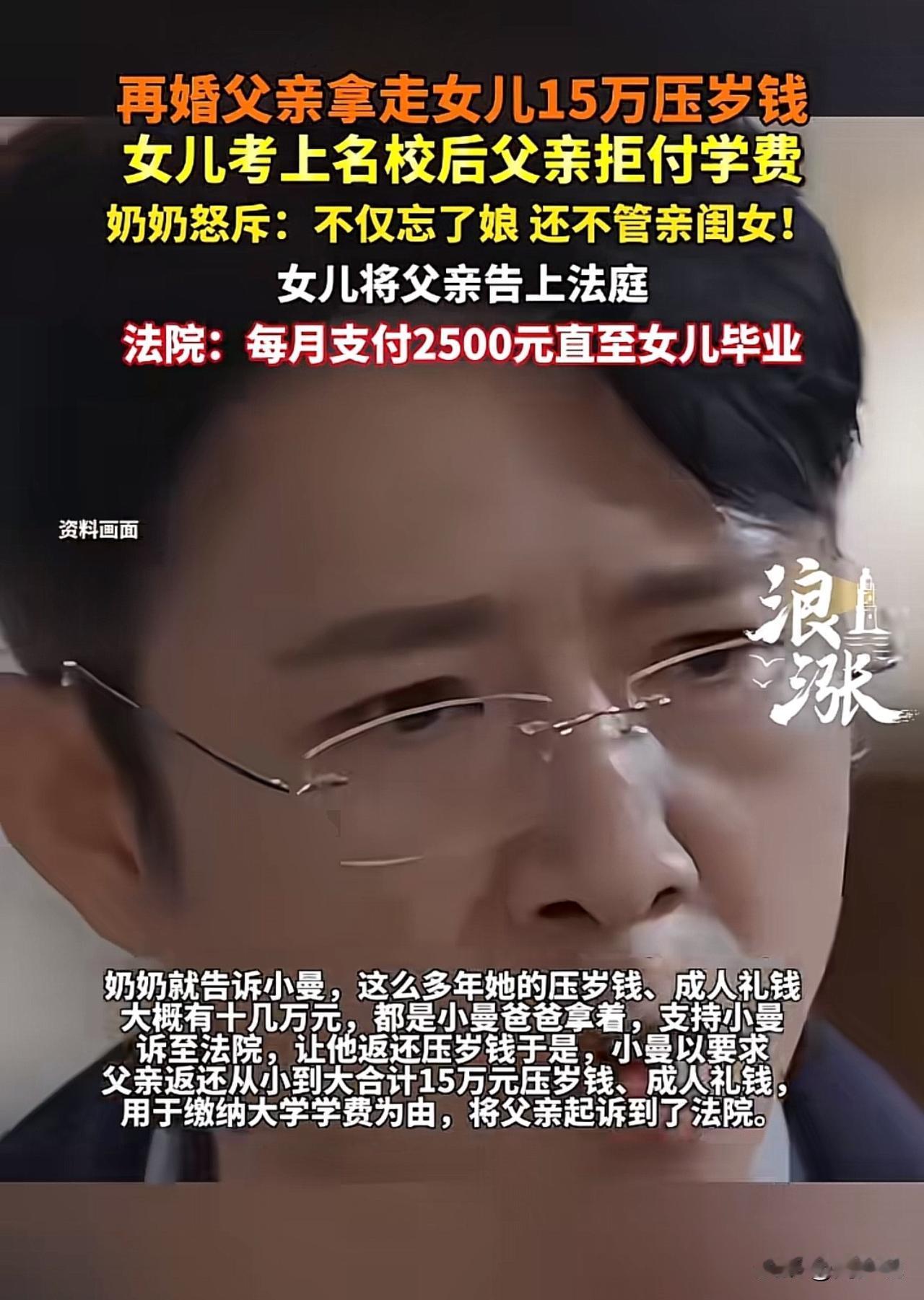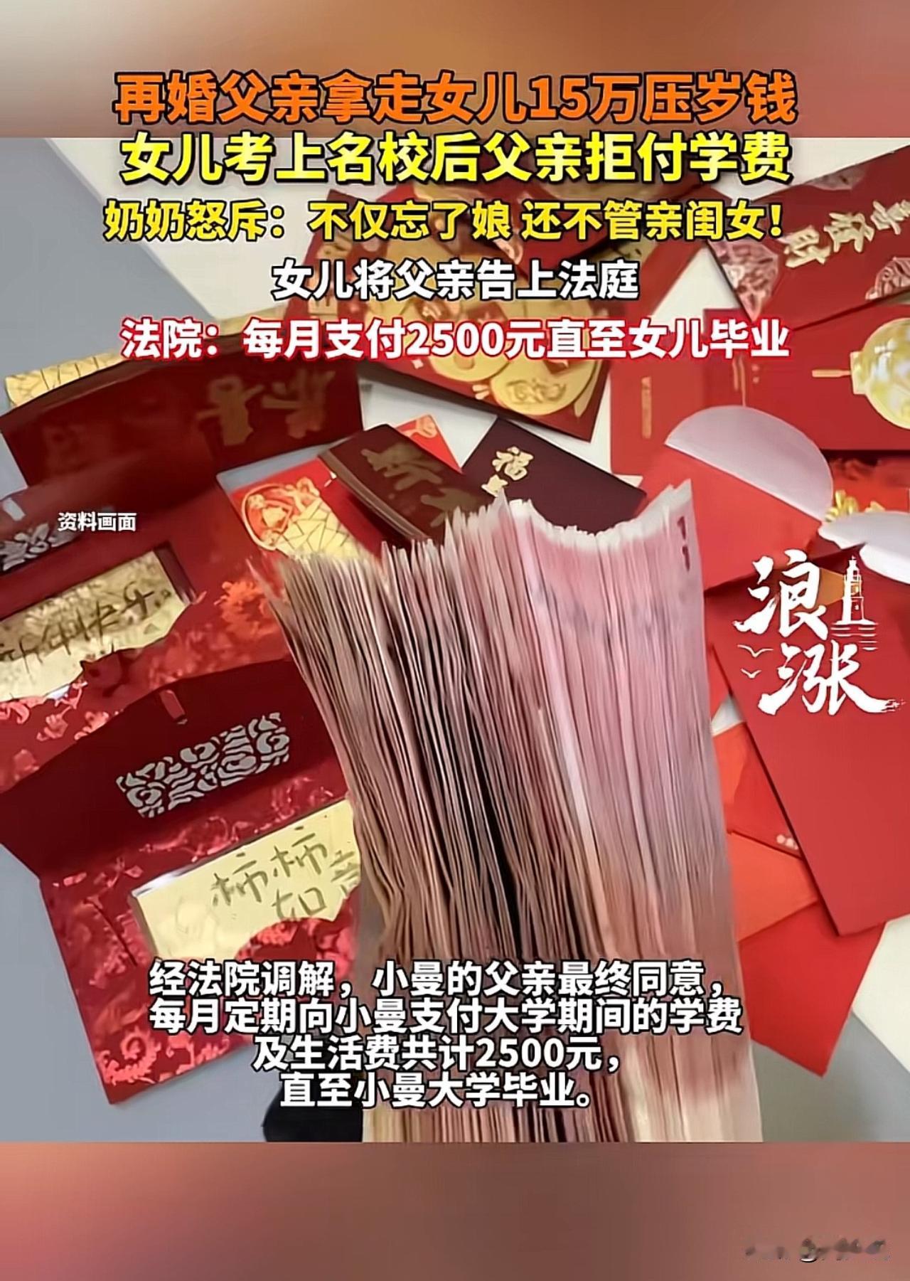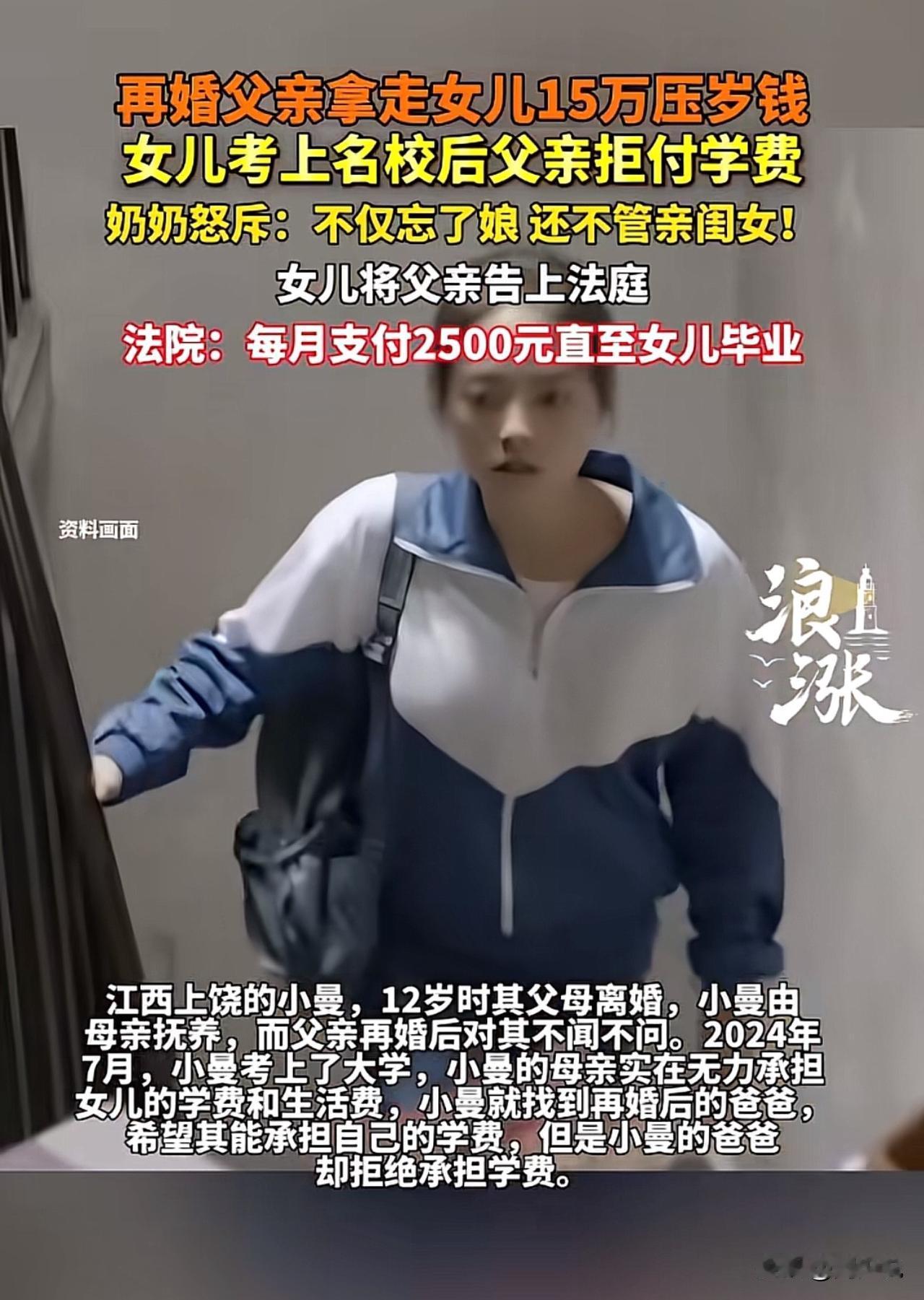 “怒了!”江西上饶一段家事纠纷,让无数网友气得睡不着。12岁父母离婚后,女儿小曼一直跟着母亲生活,父亲再婚便对她不管不问。直到小曼考上大学,母亲无力承担学费,她只能低头找父亲求助,没想到直接被狠心拒绝。 更让人心寒的是,小曼从小到大攒下的压岁钱、成人礼钱,足足15万,全都被父亲牢牢攥在手里。得知儿子的做法,奶奶当场怒斥:忘了娘,也不管亲闺女! 无奈之下,奶奶支持小曼将父亲告上法院。最终经过调解,父亲才答应每月支付2500元,直到女儿大学毕业。 这事在网上曝光后,网友纷纷指责:“压岁钱是孩子的私产,当爹的霸占不说,连学费都不肯出,太让人寒心”。 在周少看来,这件事早已不是钱的问题,更戳中了家庭教育与亲情责任的痛点。很多父母常常忽略,孩子的财物同样受保护,随意占用、支配,看似小事,实则会一点点消耗亲子间的信任。 为人父母,离婚不是推卸责任的理由,再婚更不是忽视孩子的借口。抚养与关爱,不是可选项,而是一份沉甸甸的义务。 真正的家庭教育,从来不是物质上的满足,而是懂得尊重孩子、守住底线、扛起责任。别让利益,冲淡了血脉亲情,也别让本该温暖的家,变成让人受伤的地方。#寻美三湘# #周少说教育#