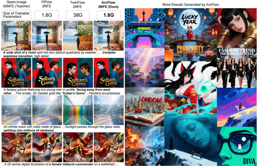 这一设计让ArcFlow能够显式地构建非线性轨迹。在2-4步的极少步数下,这种非线性轨迹比生硬的直线能更精确地贴合教师模型的原始路径。