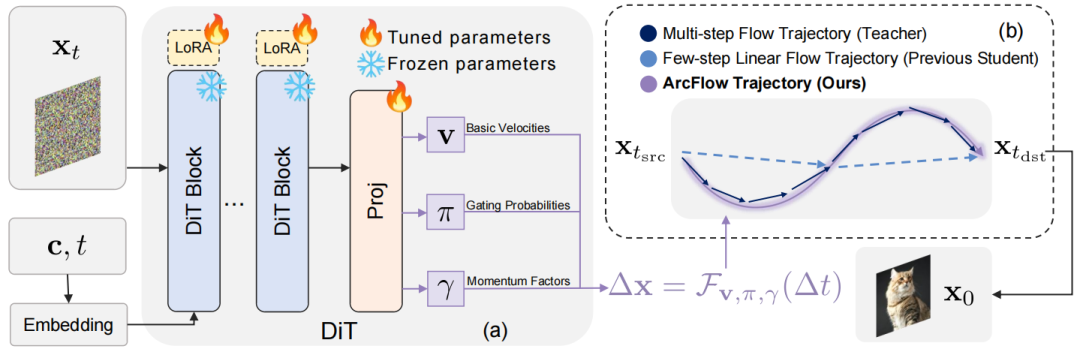 ArcFlow团队重新审视了教师模型的轨迹,根据ODE的理论规律,在相邻的时间步之间,去噪的速度方向并不是跳跃式变化的,而是存在极强的相关性。这就像一辆赛车在过弯道,下一秒的方向和速度,很大程度上取决于当前秒的状态和惯性。既然教师模型的轨迹本身就是连续变化的,为什么我们不直接去建模这种“变化规律”,而不是强行把它改成直线呢?