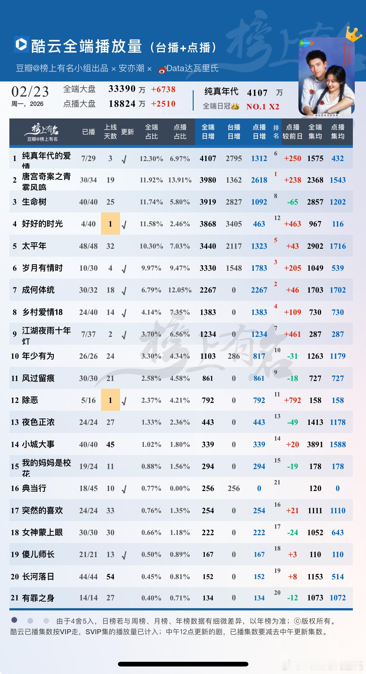 2.23酷云播放量1 纯真年代的爱情 全端日冠👑×2; 点播1312 +2502 唐宫奇案之青雾风鸣 点播+238,集均破1500万❗️3 生命树 -65 集均破1200万4 好好的时光 首播点播463 5 太平年 +43 点播集均破1700万❗️6 岁月有情时 +205 点播端1783万7 成何体统 +46 点播集均破1700万❗️8 乡村爱情18 +1099 江湖夜雨十年灯 +461 次日点播端1234万10 年少有为 -3111 风过留痕 -1812 除恶 首日792