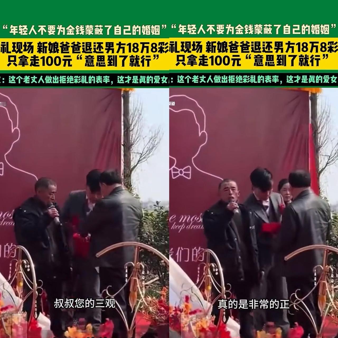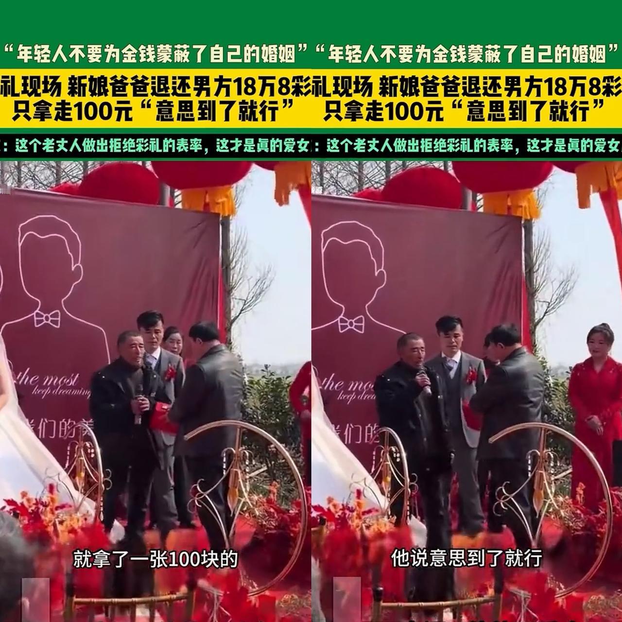18万8彩礼当场退回,只收100块!安徽这位父亲一句话,点醒无数人 结婚到底是结感情,还是结价钱?如今不少家庭被天价彩礼压得喘不过气,偏偏有人用最实在的举动,给所有人上了一课。 2月23日,安徽一场婚礼上,新娘父亲的操作直接让全场沸腾。男方诚意送上18万8千元彩礼,这本是当地常见的心意表达,可这位父亲接过红包后,没有丝毫犹豫,当场把这笔钱全数退还给男方,只从里面抽出一张100元纸币,笑着说意思到了就行。 没有刻意煽情,没有拐弯抹角,他当着所有亲友的面,认真告诫在场年轻人:千万别被金钱蒙蔽了自己的婚姻。简简单单一句话,没有大道理,却比任何祝福都有分量。 老祖宗早就说过:嫁女择佳婿,毋索重聘。婚姻的根基从来不是堆出来的彩礼,而是两个人真心相待、携手过日子的心。现在很多地方被攀比风气裹挟,彩礼越涨越高,一场婚事掏空两代人积蓄,本该甜蜜的喜事,变成了沉甸甸的负担。 好在越来越多人开始清醒,全国多地推进婚俗改革,倡导简约婚嫁,江西、浙苏皖交界等地都在抵制高价彩礼,鼓励零彩礼、低彩礼,让婚事回归情意本身。这位安徽父亲的做法,正是婚俗新风最好的证明。 网友们纷纷点赞,说这才是真正爱女儿的父母。他们不图钱财,不挣面子,只希望孩子婚后没有压力、轻松幸福。比起用彩礼衡量价值,这份通透与格局,才是给新人最珍贵的嫁妆。 婚姻不是买卖,彩礼只是礼节,真心永远比金钱更贵重。愿每一对新人,都能不为钱财所累,只为真心相守;愿每一场婚礼,少一点攀比算计,多一份真诚温暖。