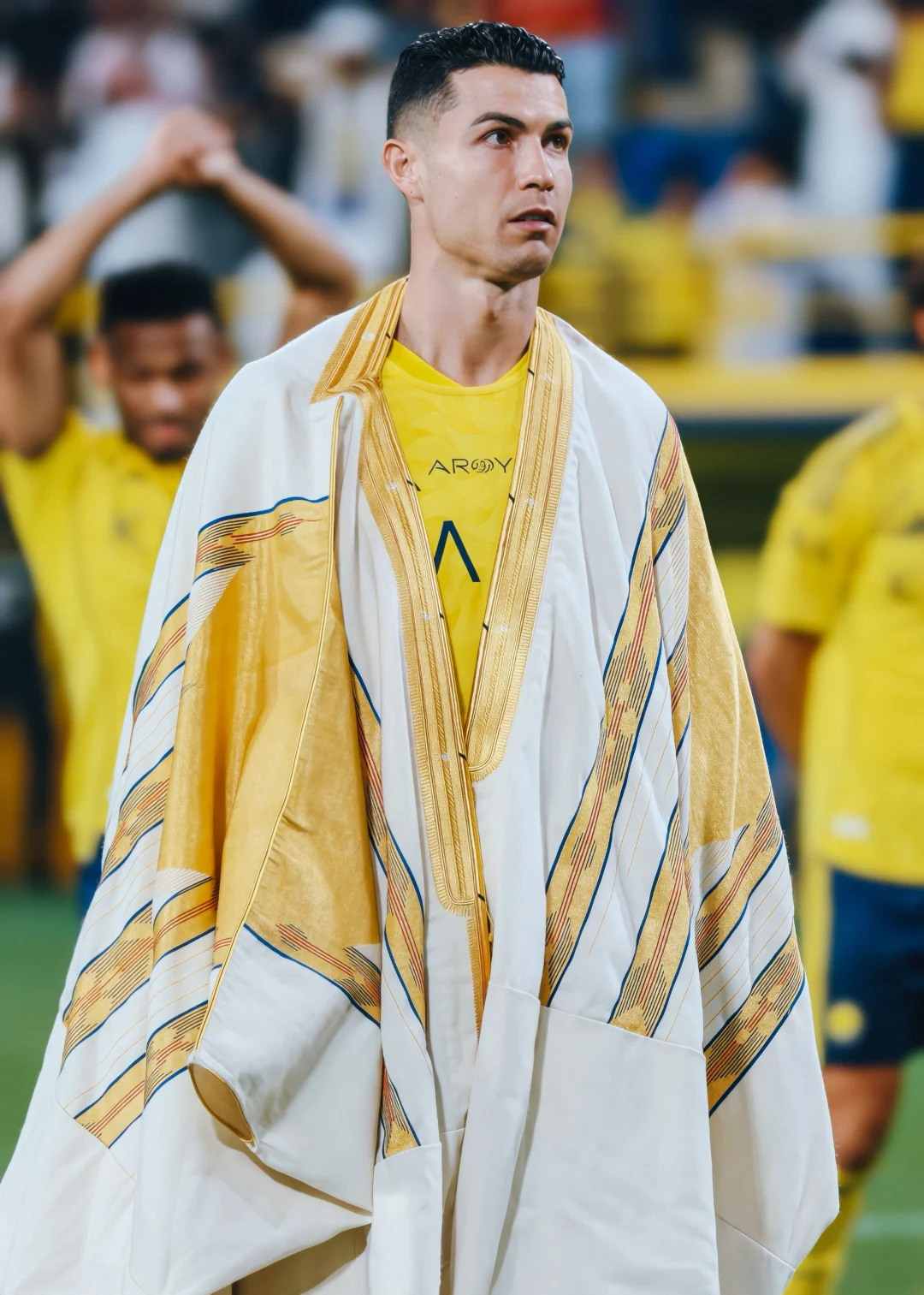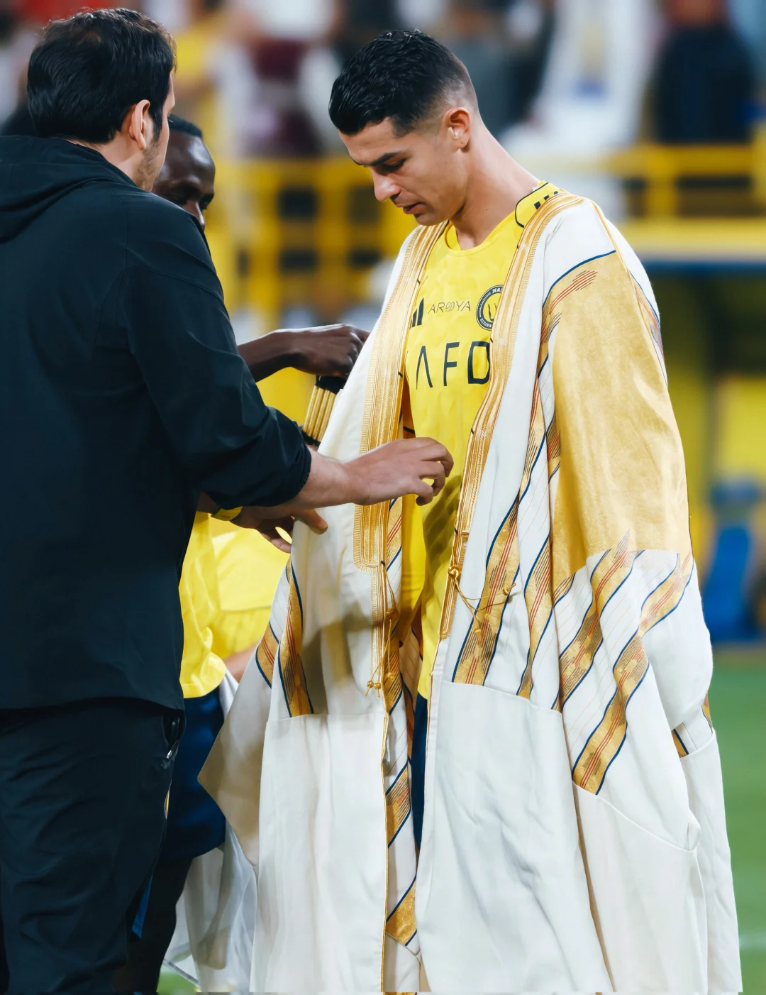 🔷 克里斯蒂亚诺·罗纳尔多身着“比什特”长袍亮相沙特阿拉伯国庆庆典,瞬间将这一沙特传统服饰从国民记忆中带到了世界舞台的聚光灯下。这件服饰从当地的庆典象征跃升为全球文化符号,以视觉方式重新定义了沙特的身份认同。