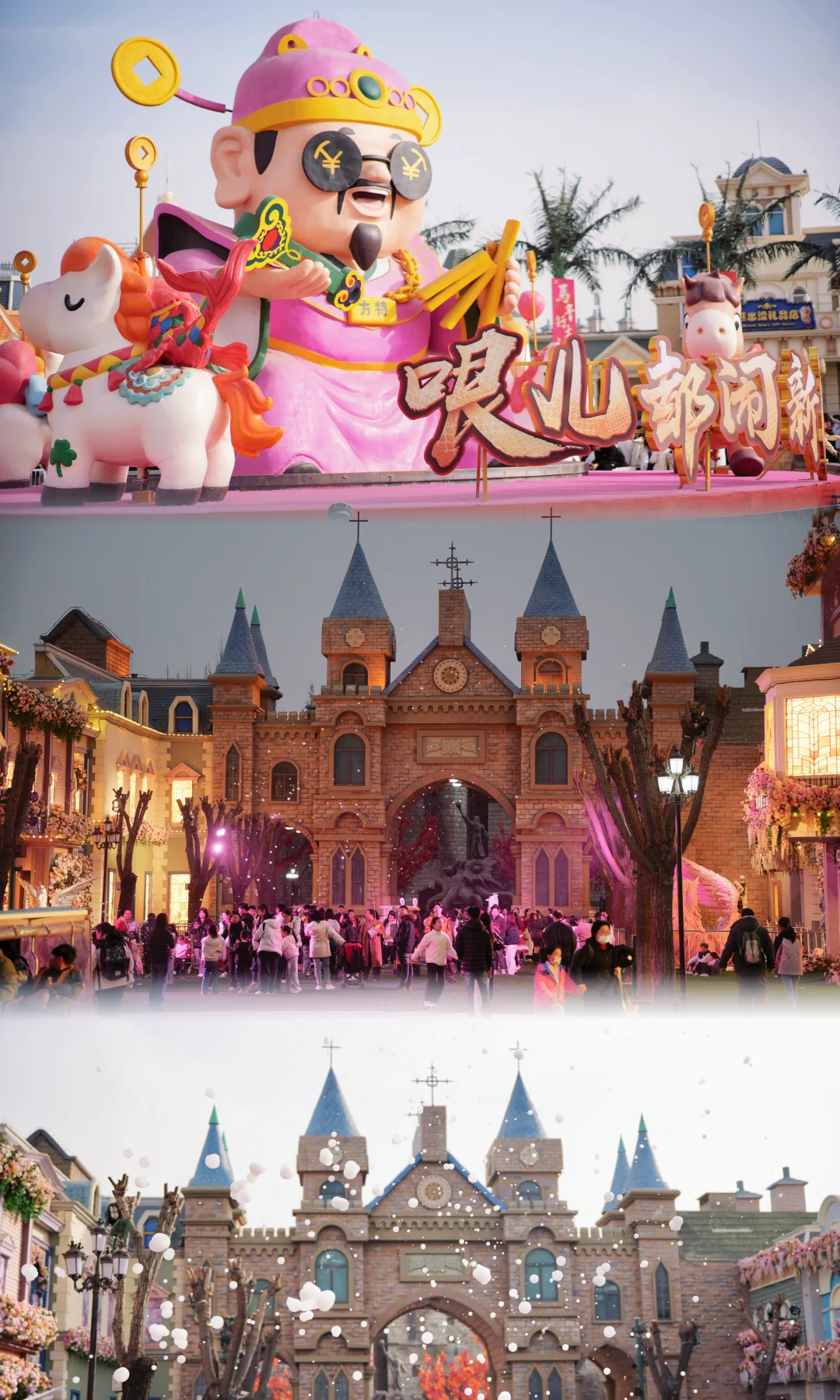 【喷泉广场】主舞台和巡游——【庙会】主要是小吃街——【熊出没山谷】——【山海神话区】晚上灯亮了也很漂亮——【原始时代区】津门大峡谷门口,可以和原始人互动——【马上哏儿市】主要NPC互动区,还有东方神韵小舞台——【冰雪城堡】——【城堡童话区】很美的花墙和巨大的粉色独角兽,嘉宾见面会也在这里——喷泉广场看演出