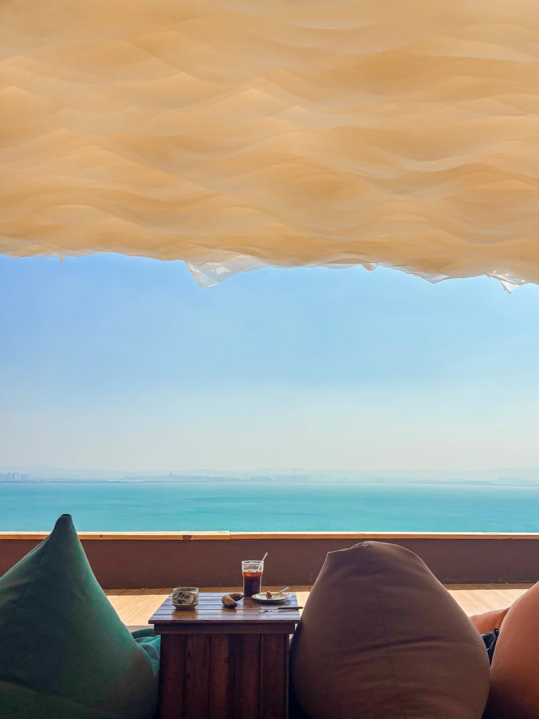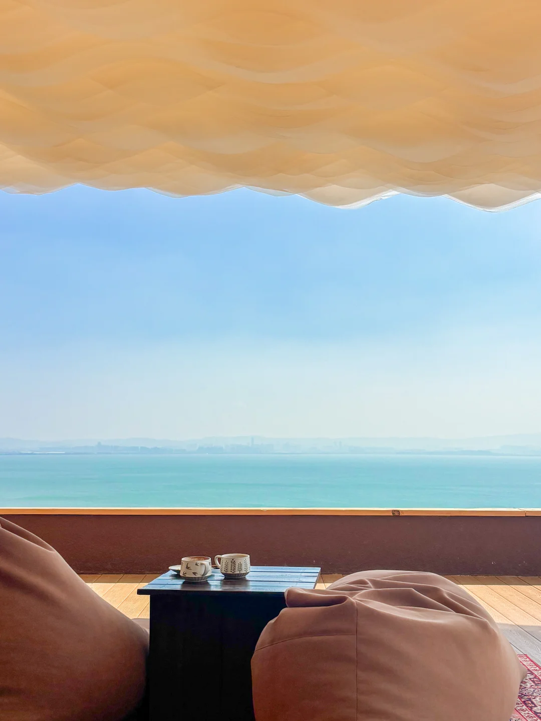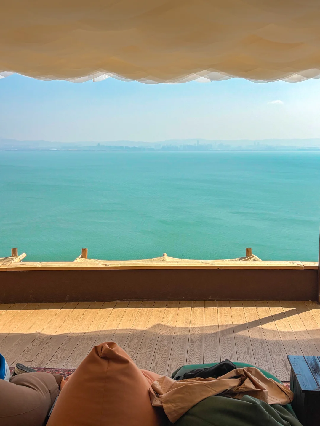进店就是扑面而来的度假感! 奶油色的纱幔随风飘动 彩色的懒人沙发随意散落 眼前就是一望无际的滇池 📍定位:春山山 🚗交通:昆明市区自驾约30分钟 💡Tips:建议选个晴天去,出片率100%!