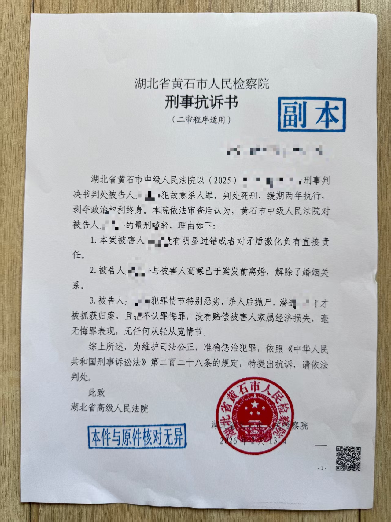 大皖新闻讯湖北黄石一对再婚夫妻,婚后经常争吵打架,两年后离婚,没想到在办理离婚登记的当晚,男子吴某平竟残忍杀害对方,后抛尸矿洞潜逃,2024年被抓获归案。2026年2月24日,大皖新闻记者从被害人女儿小李处获悉,2026年2月12日,吴某平犯故意杀人罪,被黄石中院一审判处死刑缓期两年执行。目前,黄石市人民检察院因该案量刑畸轻向湖北省高院提出抗诉。