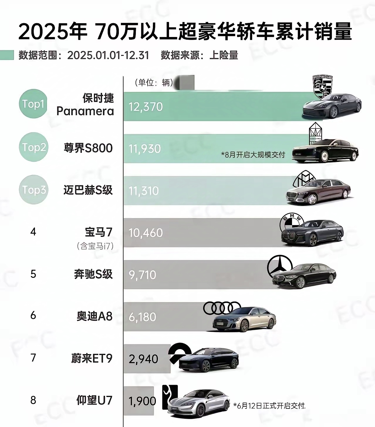 第一,帕拉梅拉,129.8万起,卖了12370辆。 第二,尊界S800,70.8万起,卖了11930辆。 第三,迈巴赫S级,146.8万起,卖了11310辆。 第四,宝马7系,62.1万起,卖了10460辆。 第五,奔驰S级,89.88万起,卖了9710辆。 第六,奥迪A8,66.34万起,卖了6180辆。 第七,蔚来ET9,76.8万起,卖了2940辆。 第八,仰望U7,62.8万起,卖了1900辆。