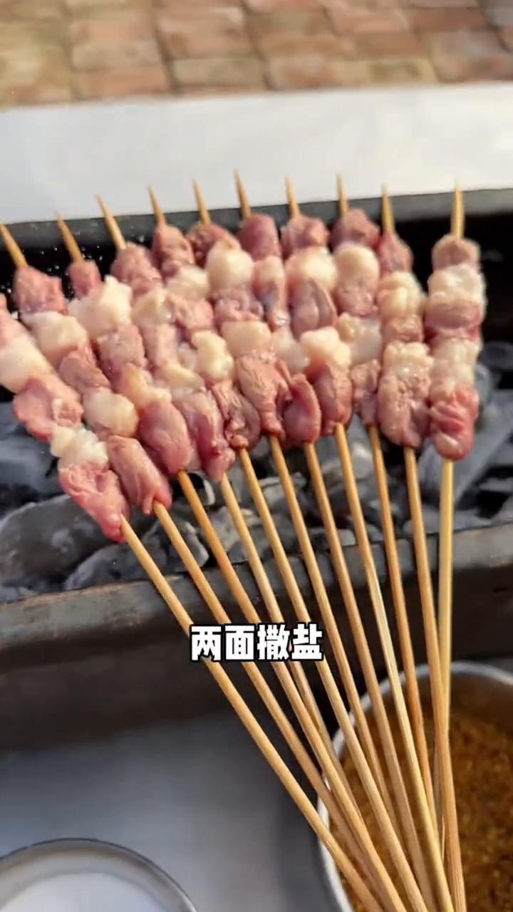 ·羊后腿分块,切一指宽厚片,改刀成条,斜刀切丁。 ·第一步撒盐,不要抓着撒雪花盐就可以,两面撒盐。羊肉串两边撒完盐以后就不要去动了,就先可一面烤,然后大火一直烤一面,不要去勤翻,老翻它热量会流失,烤出来不好吃,不用管它了。 ·风点火,看到了吗?油白色的烤成黄色的就翻面,不用听那些乱七八糟的,变成黄色的开始翻面烤背面,看着吗?背面油也变成黄的了。 ·打散,打散以后干啥?找第三面,看有没有没熟的面给它冲下,再烤一下第三面,比如说这面生点,是不是给它冲下。 ·第三面烤好以后,准备撒烧烤料,记住撒烧烤料的时候,一定要等羊油冒花的时候,把油烤出来以后,一这油能挂得住这个料,二现在这个油非常的高温,能把料的香味,孜然的香味给它炸出来,这不就烤好了吗羊肉串。