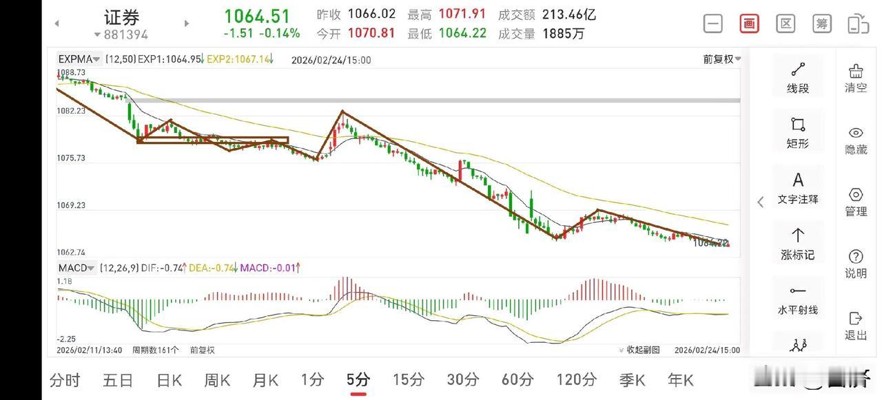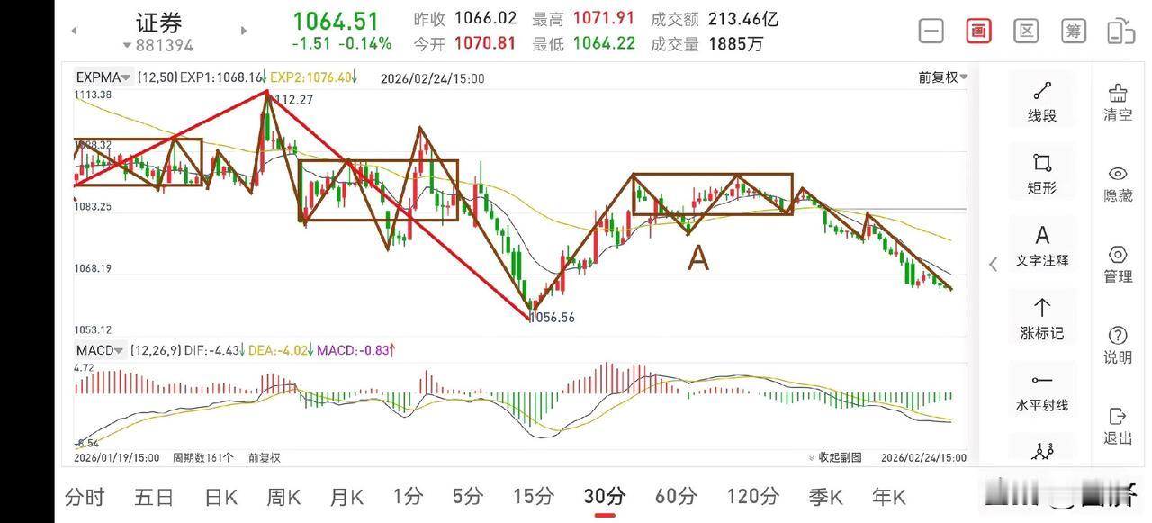 证券板块复盘(2026.2.24) 从证券板块一天的走势来看,目前仍处于底部震荡过程中,不会大涨也不会大跌,下行空间也就在1056.56附近,明天依然会是一个冲高回落,构建双底的过程。 1.从30风险图一上看,与节前相比,跌幅明显收窄,kdj指标已出现底部背离,此处有反弹的技术需求,但还没出现30分钟中枢结构,因此,明天有望构建30分钟中枢,然后逐步向1056.56靠近的过程。 2.从5分钟图二上看,明天反弹会构建一个诱多型中枢结构,所以明天有望向上冲高5分钟一笔,但仅此而已,终究还是要下来的,不会操作的还是以7成仓位持股观察吧!耐心等待日线一笔回调结束后再考虑回补三成仓位。到时我也会做出友情提醒。证券板块解析 股市波澜再起,你准备好应对了吗?