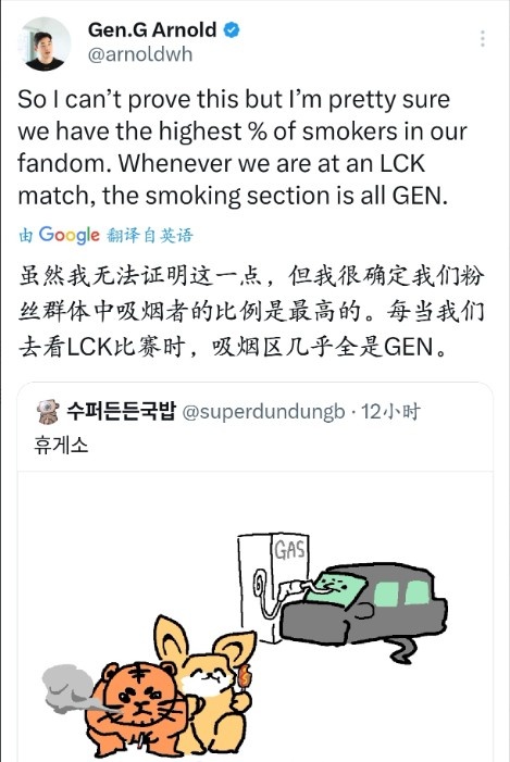 虽然我拿不出证据,但我可以肯定,我们粉丝群体里的吸烟比例是最高的。每次去看LCK现场比赛,吸烟区几乎都是Gen.G