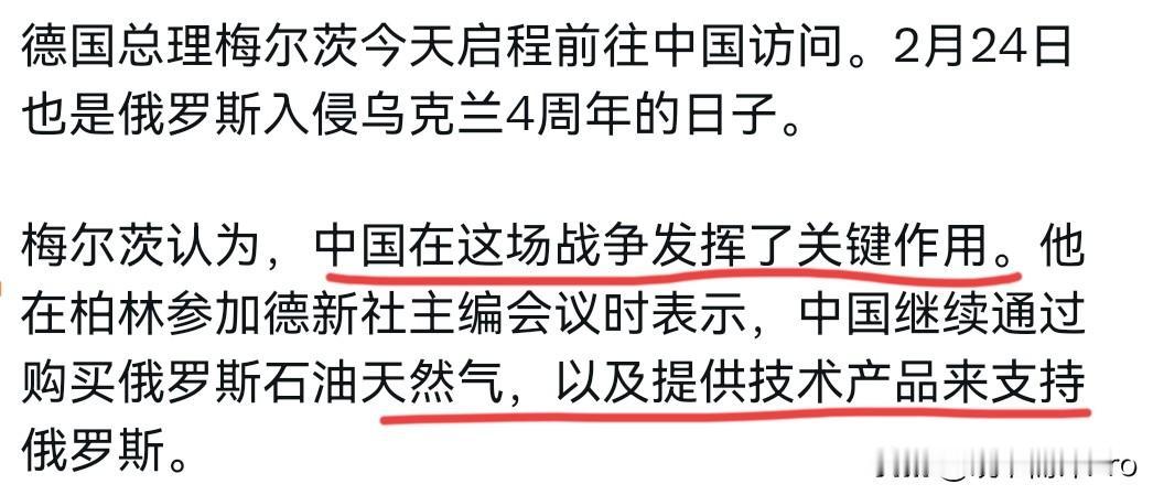 德国总理默茨再次对我们施压!2月24日,德国总理默茨表示,中国在这场战争发挥了关键作用。中国继续通过购买俄罗斯石油天然气,以及提供技术产品来支持俄罗斯。如果中国明天告诉普京:停手吧,那么普京后天就不得不停下来。我只是想努力了解中国。 反过来,我也想解释一下我们的立场,我个人在德国和欧洲的立场,我对某些全球形势的看法,以及我们可能共同努力的方向。我希望我们能够进行坦诚的讨论。很显然,德国总理这一讲话,所谓的中国在这场战争发挥了关键作用,明显是在对我们施压。当然,尽管德国非常不切实际的认为我们只需要一句话就能够结束俄乌战争,但是德国明显也在保持克制。 因为,德国总理倒是罕见的没有对我们进行批评或对我们进行指责。这说明什么呢?这说明德国明显是以俄乌战争施压我们,以在谈判桌上获取筹码。事实上,德国总理的访华行程,重点就在于经贸合作,而至于俄乌战争,不是中德会谈的重点,而近30家企业高管随团访问,就是明证。就俄乌战争而言,这一场战争,我们不是当事方,中国会发挥作用,但各国决不应该把我们当成是甩锅卸责的对象。德国的这一表态,有自己的算盘,但我们不会照单全收。