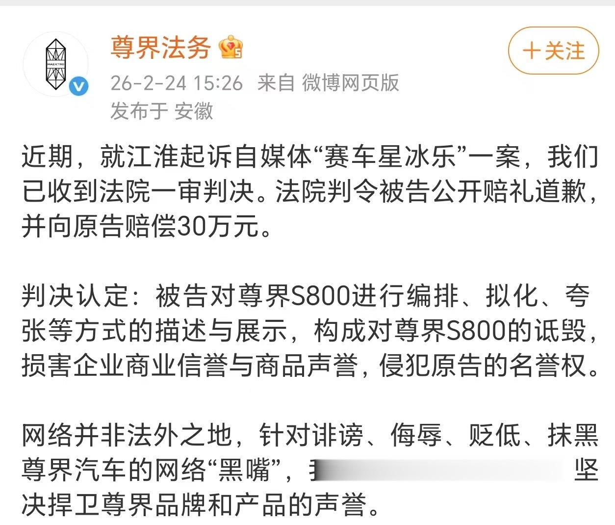 同日,尊界法务也发布声明称,近期,就江淮起诉自媒体“赛车星冰乐”一案,公司已收到法院一审判决。法院判令被告公开赔礼道歉,并向原告赔偿30万元。判决认定:被告对尊界S800进行编排、拟化、夸张等方式的描述与展示,构成对尊界S800的诋毁,损害企业商业信誉与商品声誉,侵犯原告的名誉权。