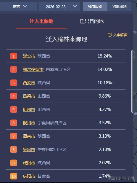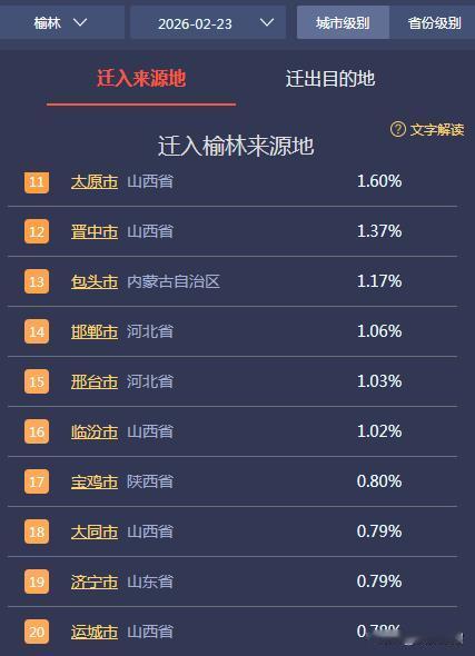 大数据:陕北榆林过大年秧歌展 (正月初七)迁入榆林前20城: 1.延安,占比15.24% 2.鄂尔多斯,占比14.02% 3.西安,占比10.18% 4.吕梁,占比9.86% 5.忻州,占比4.27% 6.银川,占比3.52% 7.渭南,占比3.10% 8.吴忠,占比2.10% 9.咸阳,占比2.02% 10.庆阳,占比1.74% 11.太原,占比1.60% 12.晋中,占比1.37% 13.包头,占比1.17% 14.邯郸,占比1.06% 15.邢台,占比1.03% 16.临汾,占比1.02% 17.宝鸡,占比0.80% 18.大同,占比0.79% 19.济宁,占比0.79% 20.运城,占比0.78% @石峁荣耀: 迁入按省份看:陕西占比33.43%,山西占比20.96%,内蒙占比17.51%,宁夏占比6.43%,甘肃占比4.53%,河北占比4.27%,河南占比3.36%,山东占比3.26%