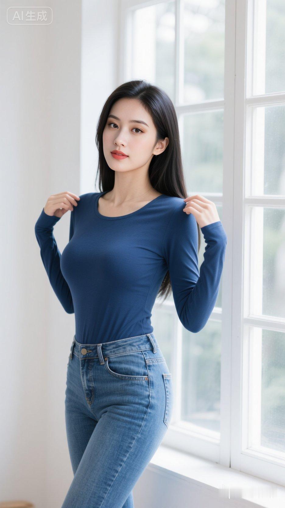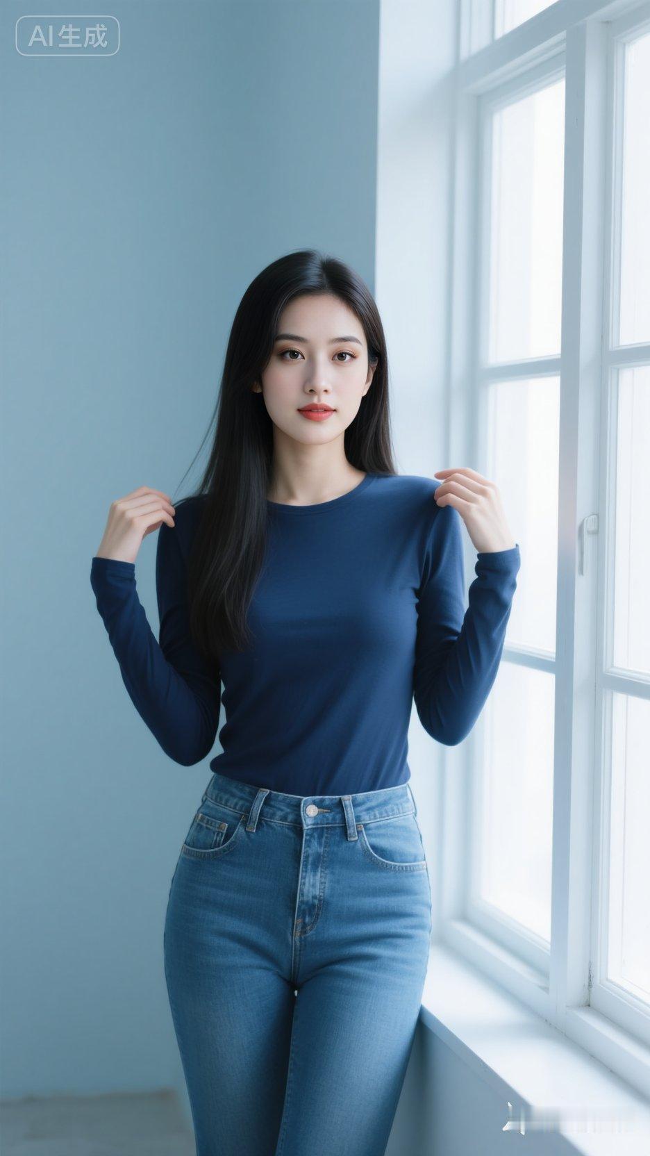 一位东亚女性,她胸形饱满,冷白肤色,有着一头乌黑柔顺的长直发,自然垂落在肩头。她穿着一件深蓝色的长袖圆领上衣,衣料贴身,勾勒出轻盈的质感;下身搭配蓝色做旧超紧身牛仔裤,凸显出姣好的身材曲线。
