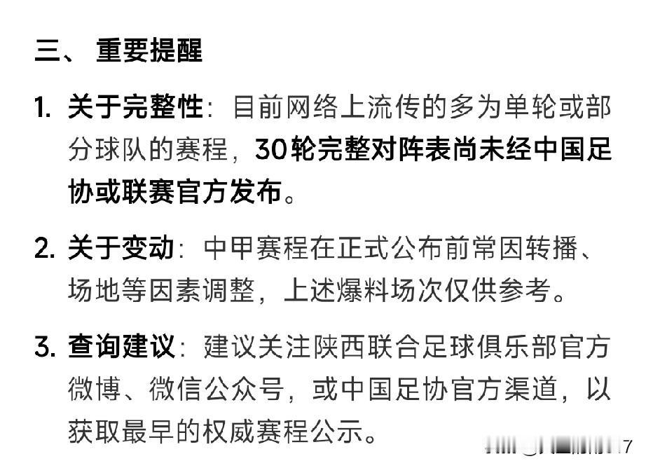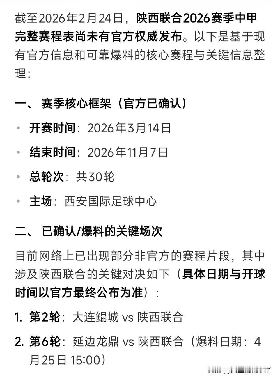 2026年中甲联赛在3月24开赛到11月7日联赛结束,查了一下今年西北狼陕西联合的对阵情况和比赛时间。目前为止都没有看到今年具体比赛时间表,看来只能等到中国足协官方和陕西联合官方的消息!心急的朋友们还是要耐心等待,坐等中国足协的官方公告。 (以上图片未经允许,严禁转载)发现必究