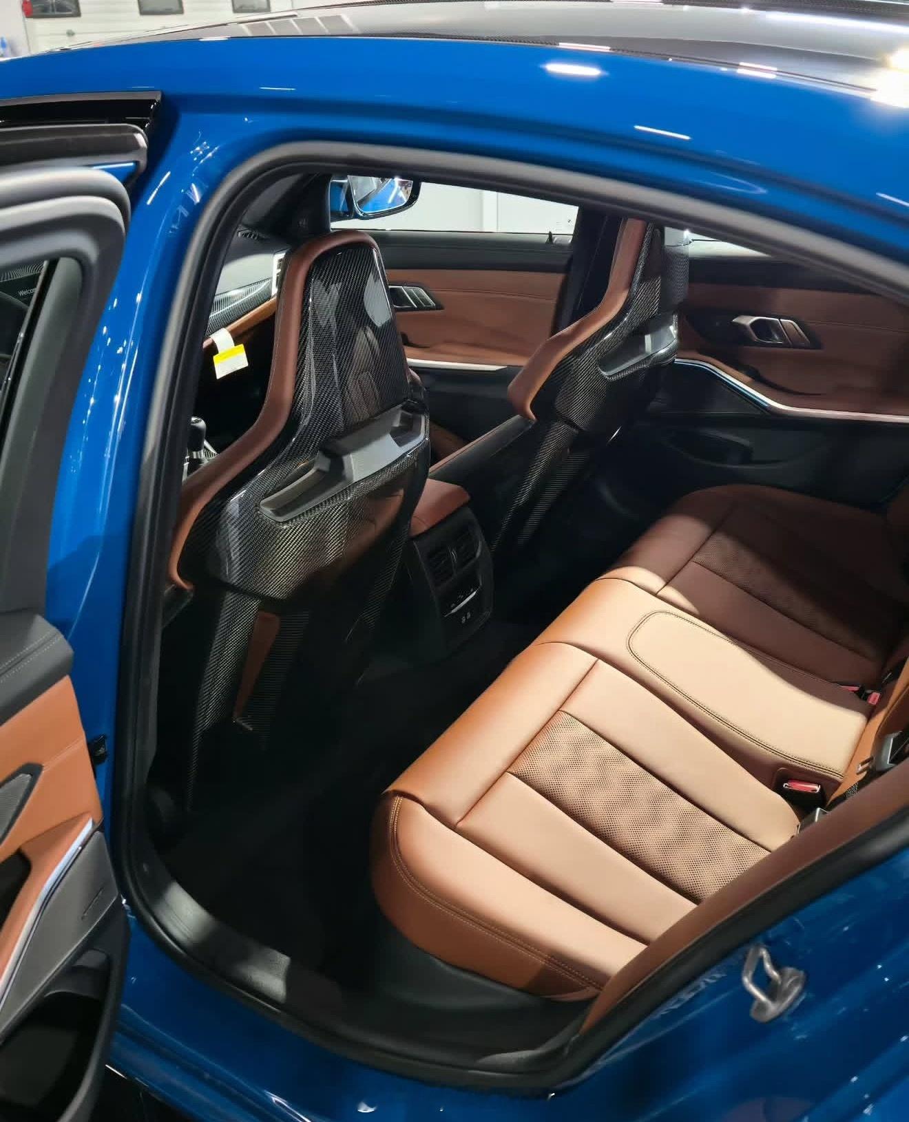 这台宝马G80 M3配备的是个性化定制的Laguna Seca Blue车漆,其中文名称是拉古纳塞卡蓝,曾经是E46 M3的标志性配色,也是宝马M粉丝心中的 “蓝月光”。图片其名字源于美国加州的Laguna Seca赛道,这条1957年落成的FIA二级赛道因 “Corkscrew(开瓶器弯)” 闻名全球,是美式赛车文化的地标之一,除了在E46 M3上配备之外,也少量用于Z3 M Coupe等车型。而现在则以个性化定制车漆供消费者选择,可用于大部分M Power车型上。相信大家也看出来了,这款车漆并不是柔和的浅蓝,也不是深沉的藏蓝,而是明亮、饱和、带有金属质感的正蓝色。
