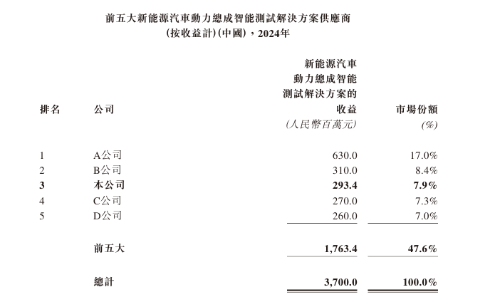 于2024年,公司为中国第三大新能源汽车动力总成智能测试解决方案供应商,市场份额为7.9%。