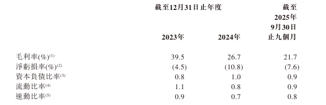 于2023年、2024年及2025年截至9月30日止九个月,该公司毛利率分别为39.5%、26.7%、21.7%。