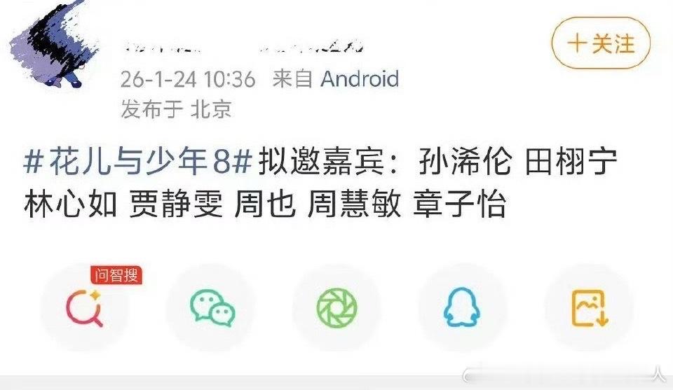 网传《花儿与少年8》拟邀嘉宾:孙浠伦 田栩宁 林心如 贾静雯 周也 周慧敏 章子怡👏花少8网传拟邀嘉宾有章子怡田栩宁花少8网传拟邀嘉宾 章子怡取关工作室换成田栩宁