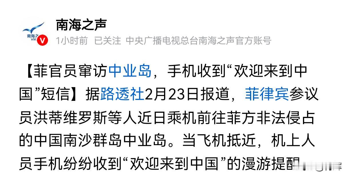 谁是主人?菲律宾高层窜访中业岛,飞机还未落地就收到一串中文 根据路透社23号的消息,菲律宾的一名参议员在窜访中业岛的时候,飞机还没有落地手机上就收到了一串中文“欢迎来到中国”! 这说明我国的通信网络已经直接覆盖了中业岛以及周边的海域和空域,明确的告诉这些菲律宾人到底谁才是中业岛真正的主人!虽然后续菲律宾海警方面声称中国入侵了他们的星链通信系统,但是在中国已经实质管控中业岛周边海域和空域实质性的维护自己主权的前提下,这种辩解是苍白无力的。 其实菲律宾也已经明显感受到了这种巨大的变化,所以这段时间菲律宾的一些高层才会如此频繁的前往中业岛进行窜访和所谓的视察。他们这样做就是想尽可能的在舆论方面引发一定的关注度,希望能够通过外界的关注和介入,尽可能的确保自己在中业岛能够长久的保留下去。 不过考虑到我国对于主权维护的决心和力度,菲律宾的这种操作注定会失败。