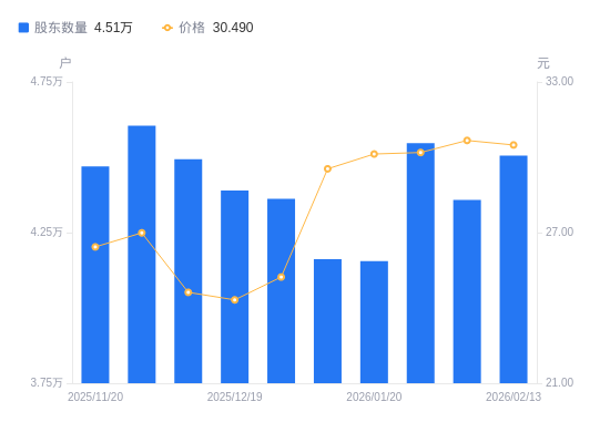日期A股户数(户)流通A股户均持股数(股)户均持股市值(万元)2026-02-13450579644.9729.412026-02-10435889970.0330.582026-01-30454709557.3728.852026-01-204155410458.0431.512026-01-094162110441.2130.842025-12-31436209962.7125.142025-12-19438979899.8524.082025-12-10449339671.5923.812025-11-28460509436.9925.472025-11-20446979722.6525.70